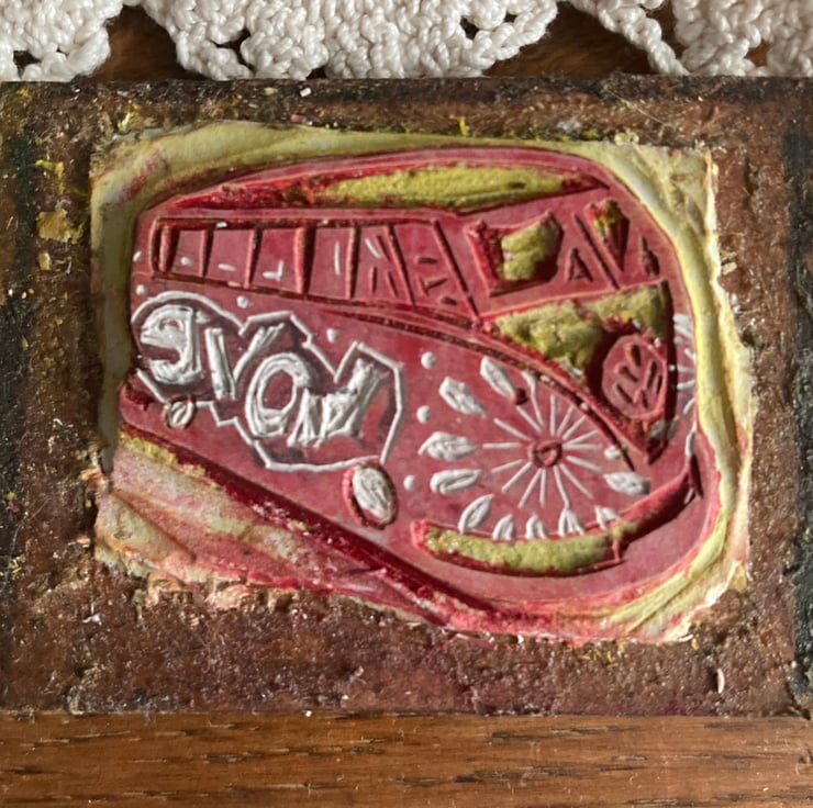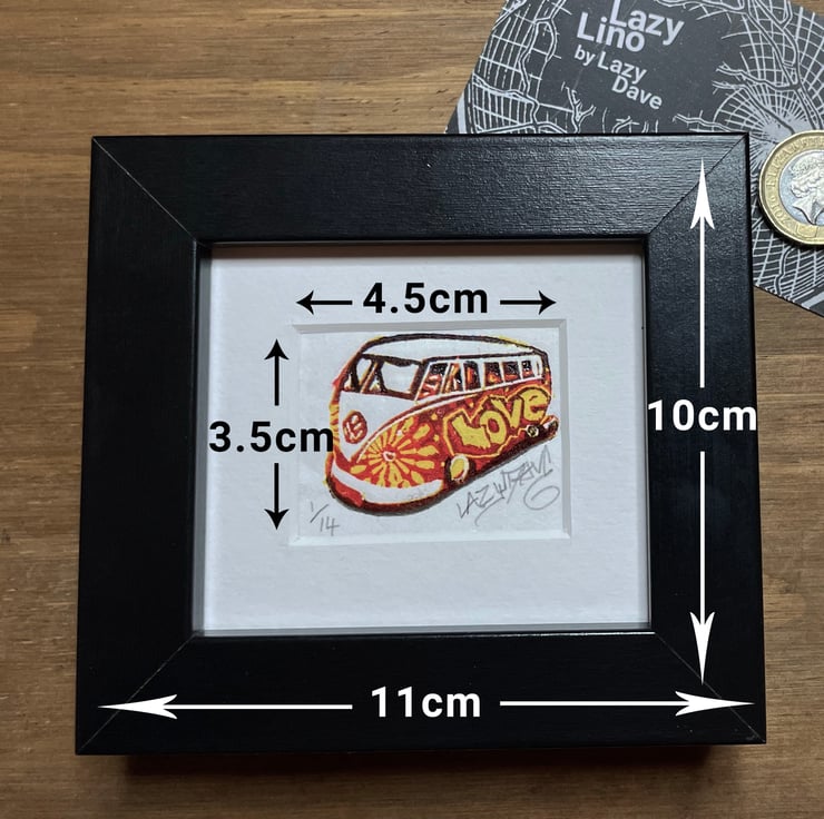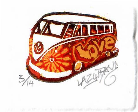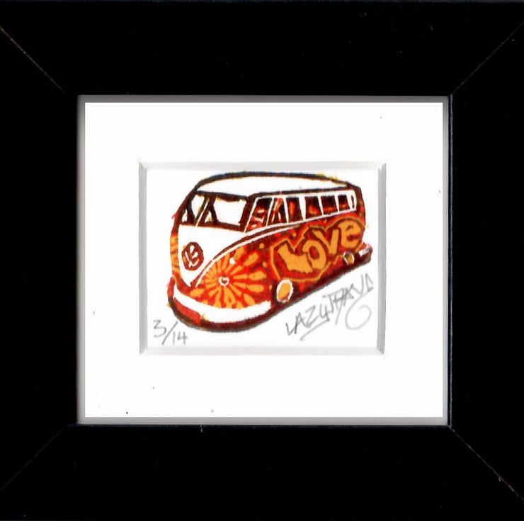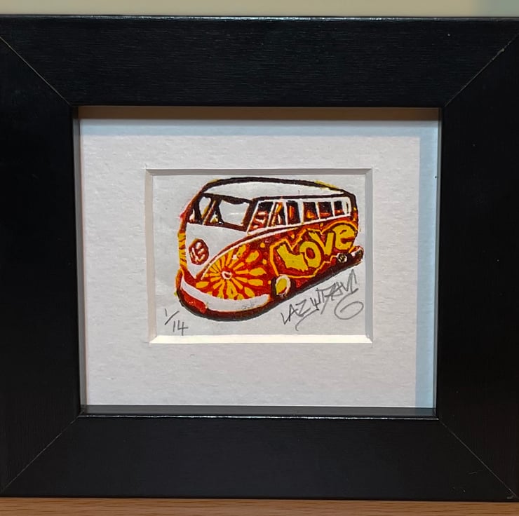 An original, framed, fun size, limited edition, colour, reduction lino print of a vintage VW Campervan Split Screen with LOVE in graffiti style on the side of the van.