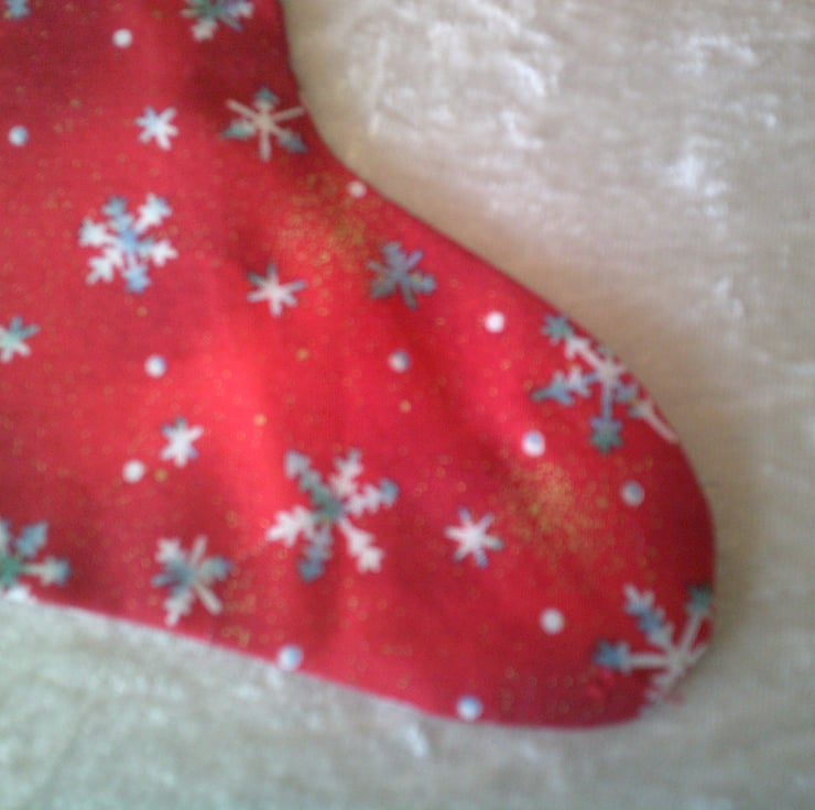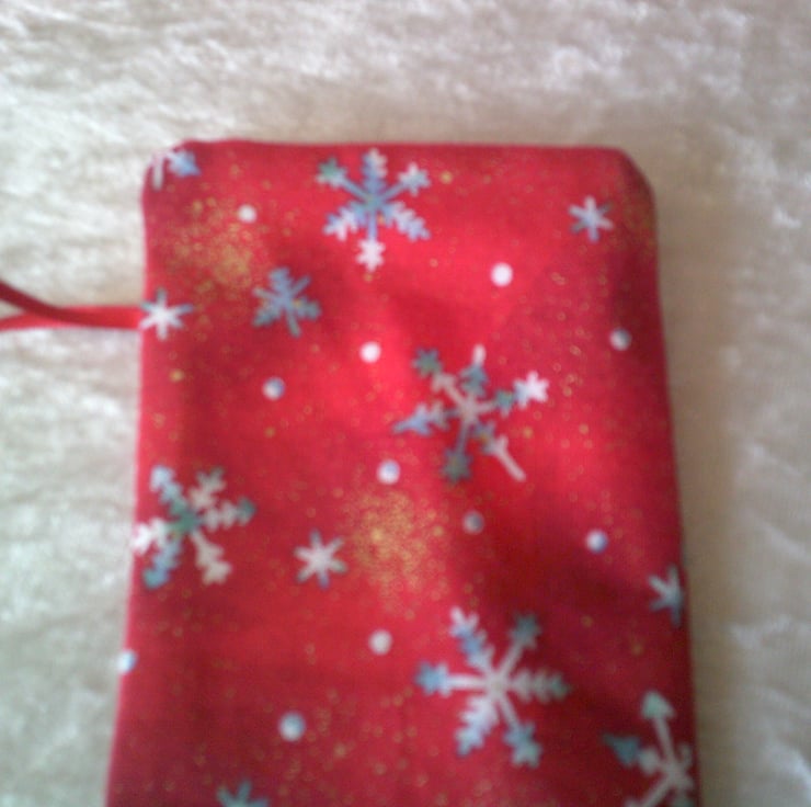 The fabric used is of various sized snowflakes on a red background. The reverse side is the same design and it is lined with red fabric.