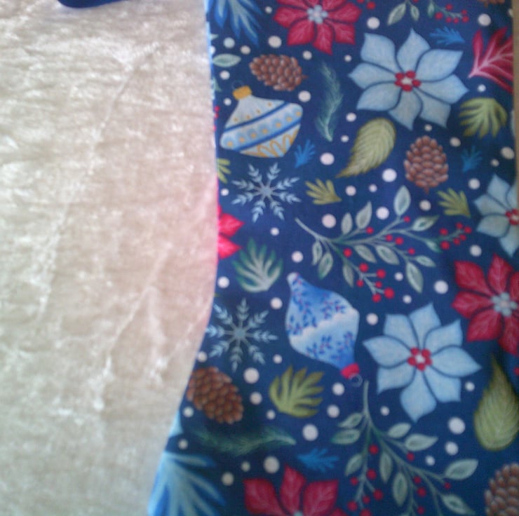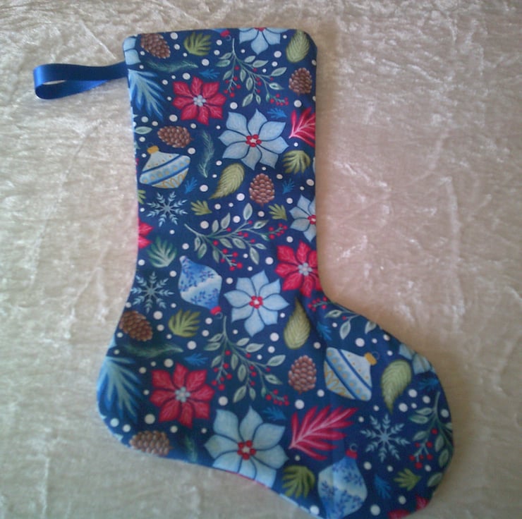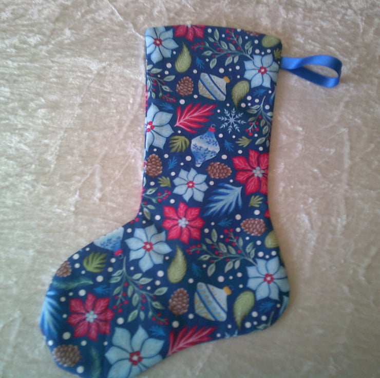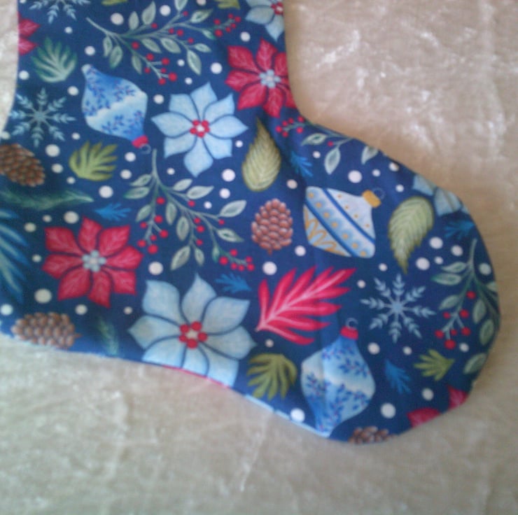The fabric used is of Pine Cones, Baubles and red and white Poinsettias on a blue background, and is fully lined.