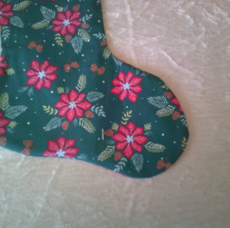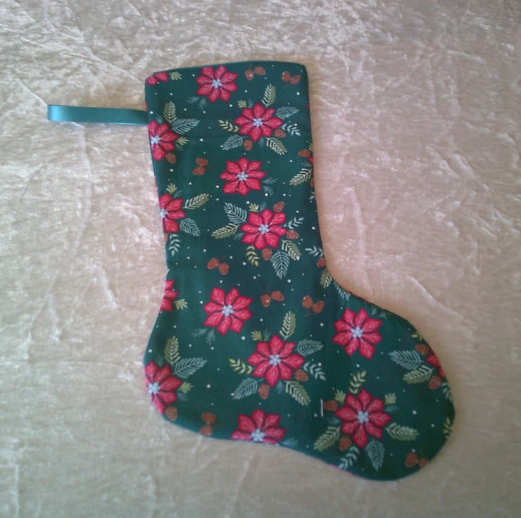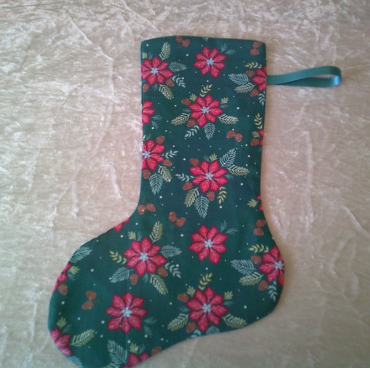 The fabric used is of Red poinsettia and fern leaves on a dark green background and is fully lined.