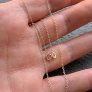 9K solid gold cable chain necklace with spring ring clasp. Stamped '9K'. This necklace is fine and lightweight and can also be called a trace chain.