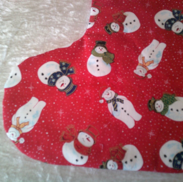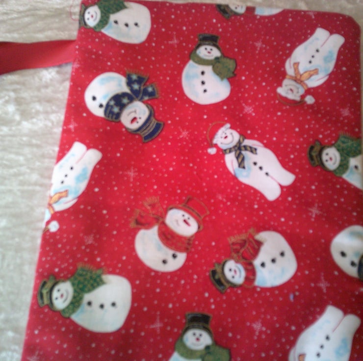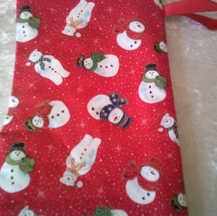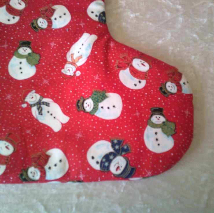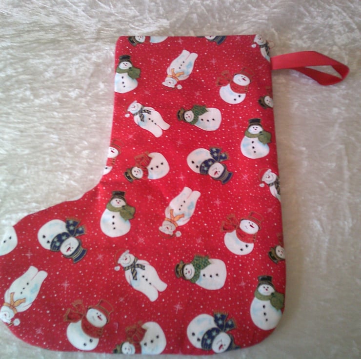 This Christmas Stocking features snowmen in hats and scarves on a red background. The design is the same on both sides so it can be hung up either way round and either be used for small gifts or just as a decoration. It could also be used to hold a Secret Santa Gift.