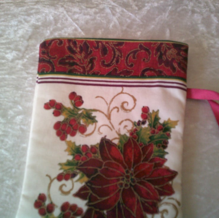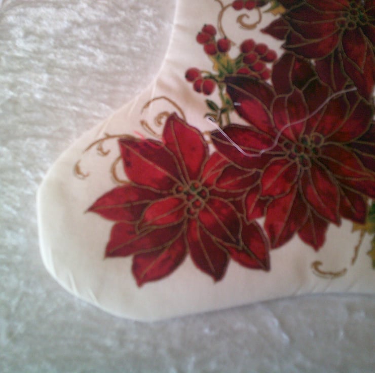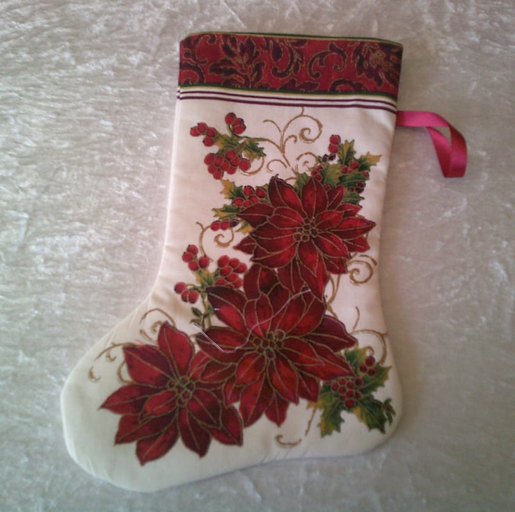 This Christmas Stocking features a Red poinsettia on a cream background and a red border at the top. The design is the same on both sides so it can be hung up either way round and either be used for small gifts or just as a decoration. It could also be used to hold a Secret Santa Gift.