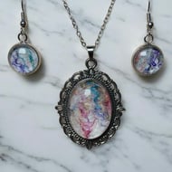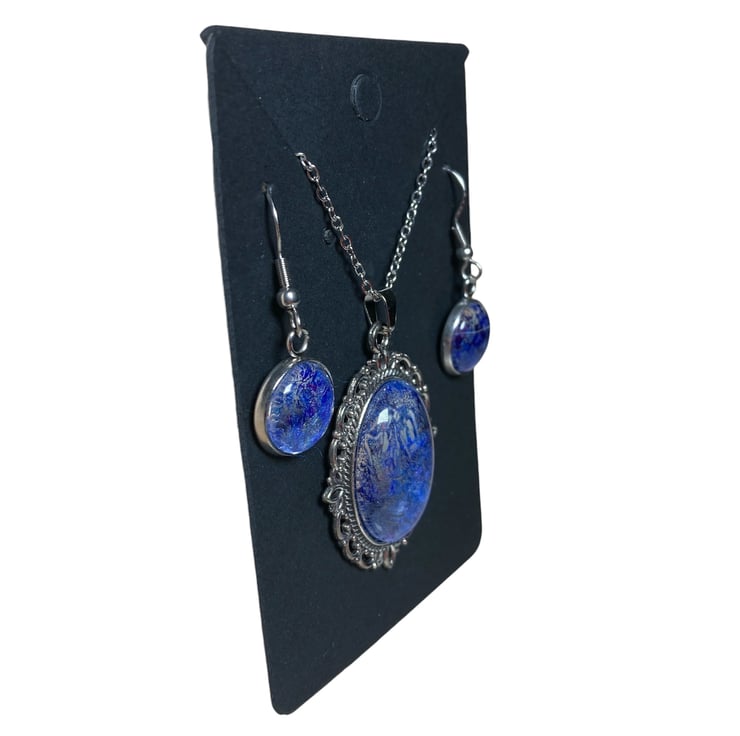 The pendant measures approximately 4cm x 3cm and is paired with an 18" silver tone chain with a lobster clasp while the earrings feature a 12mm tray attached to fish hook style fittings.