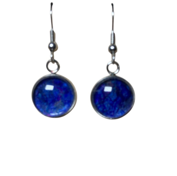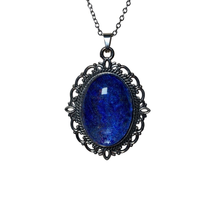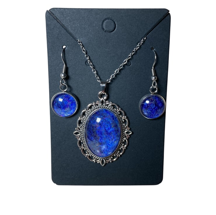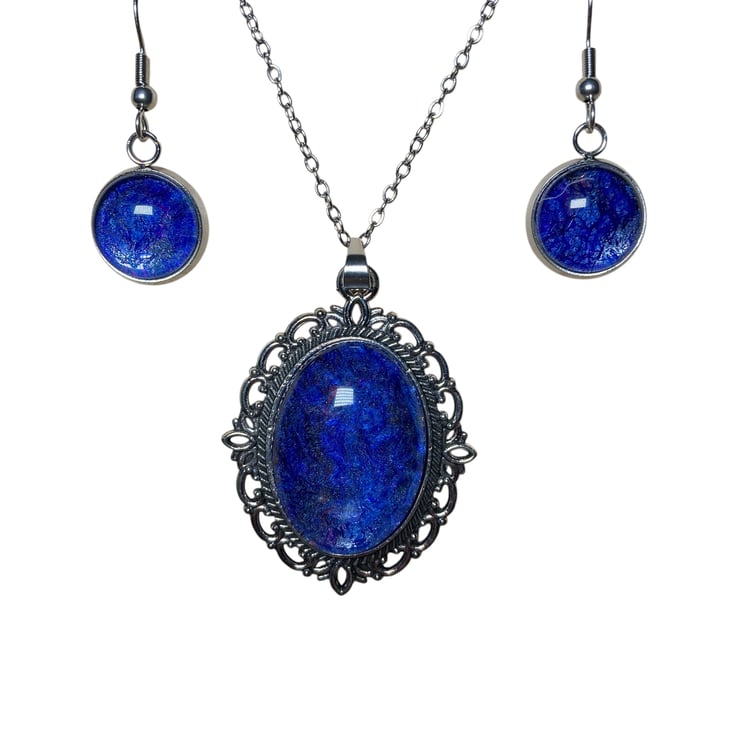 This stunning handcrafted jewellery set features a pendant necklace and matching earrings. The centrepiece of this jewellery is a piece of blue handmade felt topped with silk fibres creating a swirl of colours on a blue background. The felt has been set beneath a glass cabochon in an ornate vintage style silver tone frame for the pendant and a plain edged frames for the earrings. This jewellery set will bring a pop of colour to any outfit with the glass cabochons enhancing the texture and colour of the wool and silk felt pieces below.