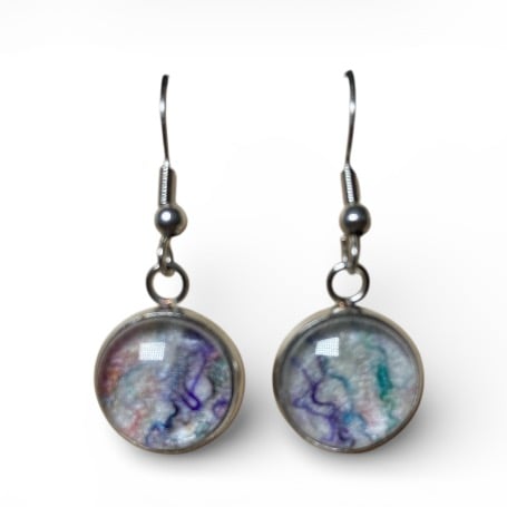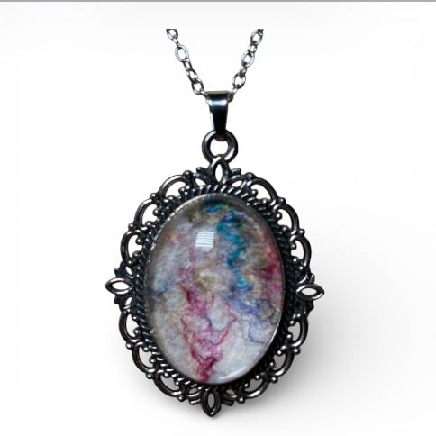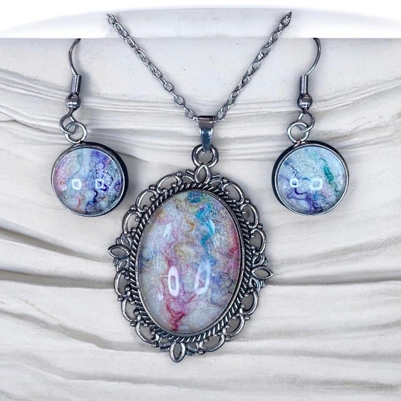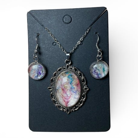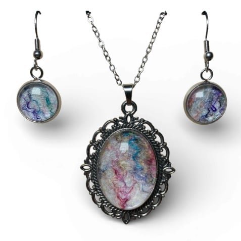 This beautiful handcrafted jewellery set features a vintage style pendant necklace and matching earrings. The centrepiece of this jewellery is a piece of white handmade felt topped with multicoloured silk fibres creating a swirl of colours on a white background. The felt has been set beneath a glass cabochon in an ornate vintage style silver tone frame for the pendant and a plain edged frames for the earrings. This jewellery set will bring a pop of colour to any outfit with the glass cabochons enhancing the texture and colour of the wool and silk felt pieces below.