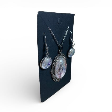 The pendant measures approximately 4cm x 3cm and is paired with an 18" silver tone chain with a lobster clasp while the earrings feature a 12mm tray attached to fish hook style fittings.