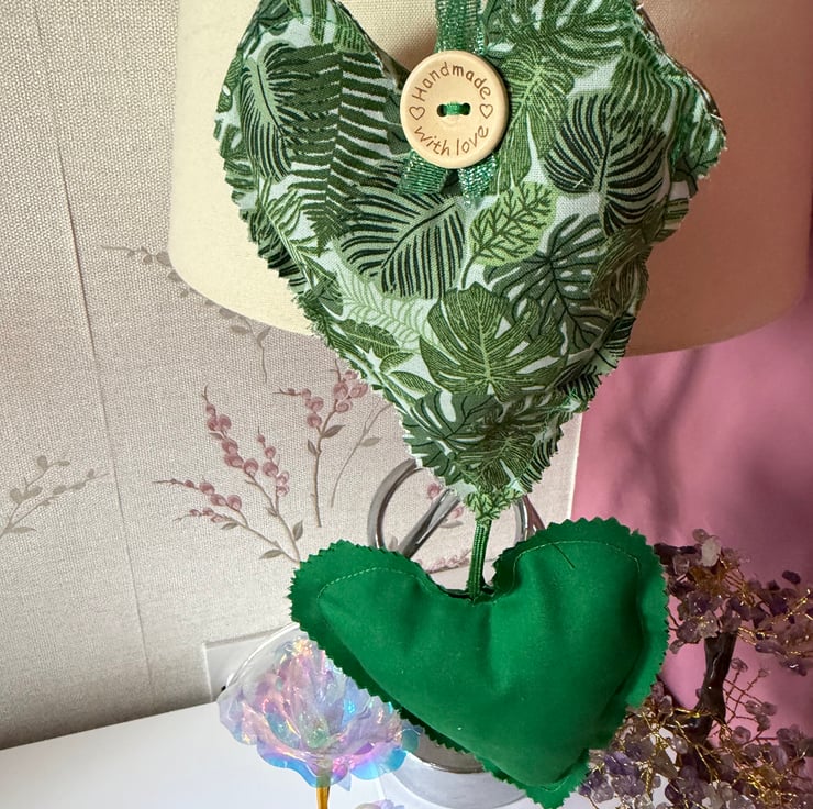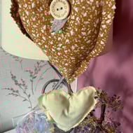 Both hearts contain lavender, they hang from a contrasting ribbon, decorated by a wooden button and are joined by contrasting cord.