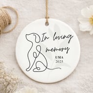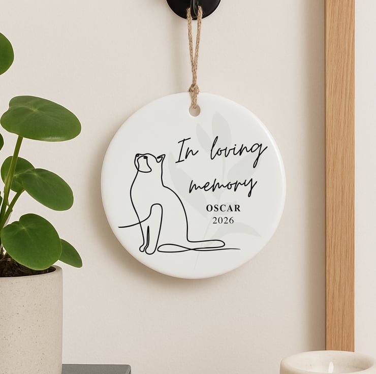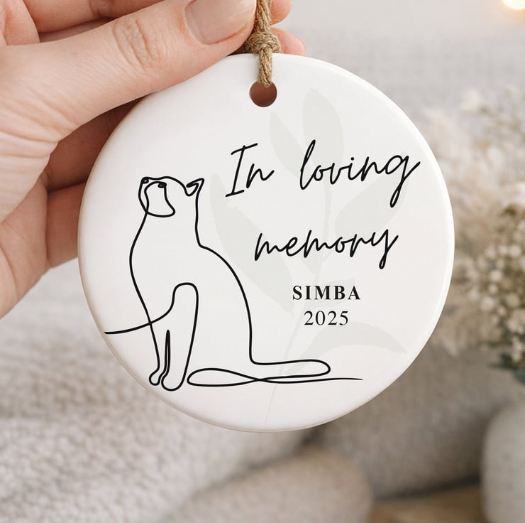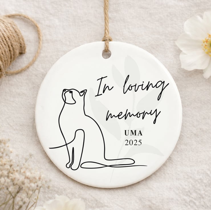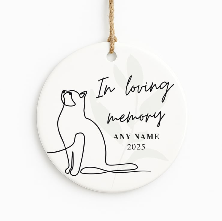 This elegant In Loving Memory cat ornament features minimalist line art and a soft botanical background, creating a timeless tribute to a cherished feline companion. Personalised with a name and year, it offers a gentle and meaningful way to keep their memory close.