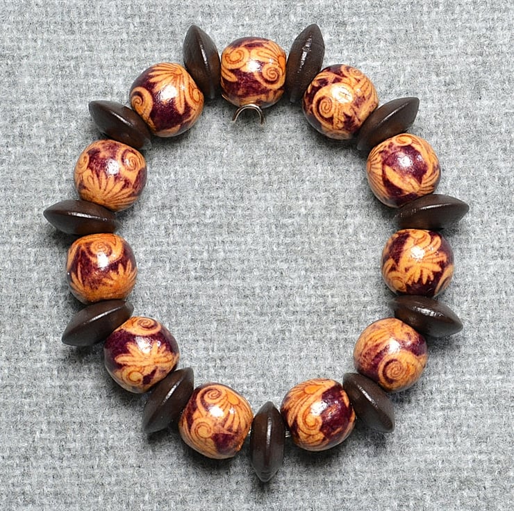 A quirky, textured, bracelet with dark brown wooden rondelle beads, and pretty. This bracelet measures approximately 19cm, or 7 1/2 inches, unstretched. It is strung on jewellery elastic, designed to be rolled over the wrist for a clasp free fit.