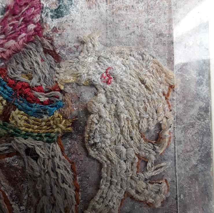 This artwork is constructed using layered textiles, hand embroidery, and mixed media on old archival paper. Every stitch is intentional, contributing to the sense of fragility, wear, and memory that runs through the series. The tactile surface and visible handwork are integral to the narrative.
