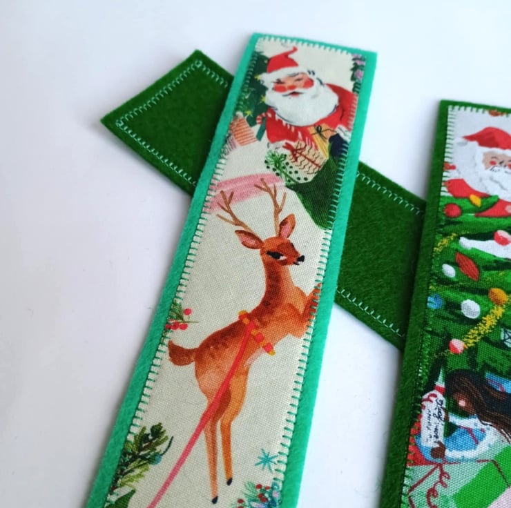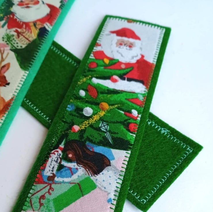 Cute little felt bookmarks with vintage style Santa fabric prints appliqued to the front. Ideal as stocking fillers or adding to Christmas Eve boxes with that new book, they can also be posted with a card for a last minute gift (see the direct to recipient listing in my shop) .
