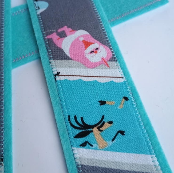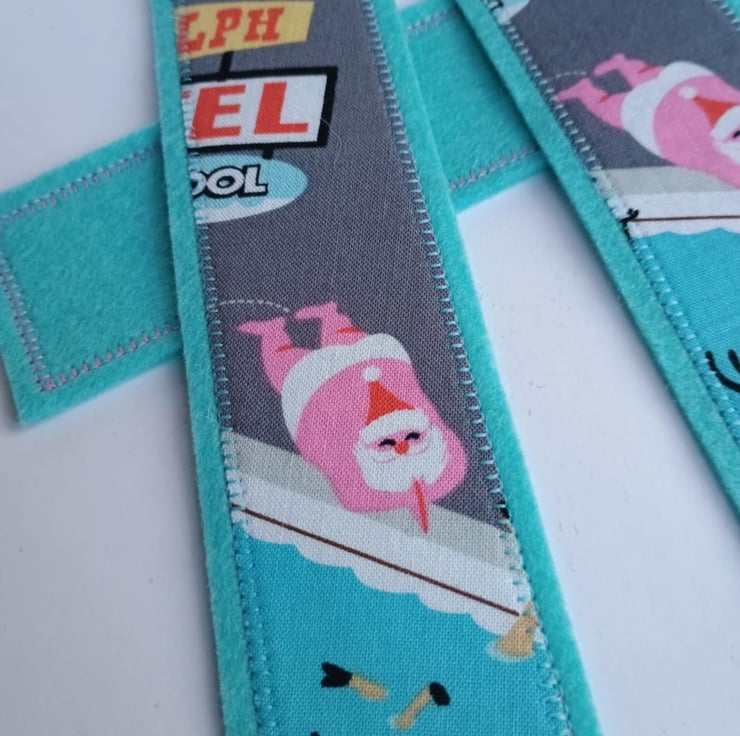 Fun fabric prints fussy cut to show off Santa, with part views of the reindeer or the motel signs, appliqued to the front of soft wool felt. Ideal as stocking fillers or adding to Christmas Eve boxes with that new book, they can also be posted with a card for a last minute gift (see the direct to recipient listing in my shop) .