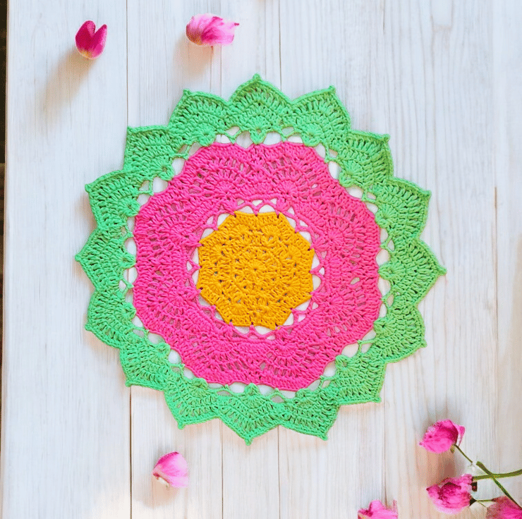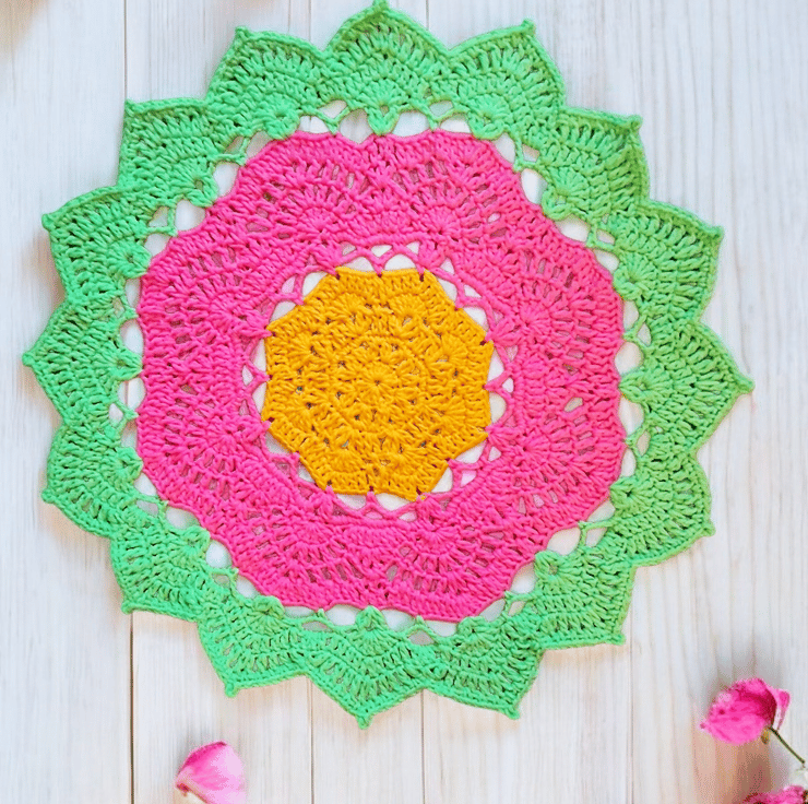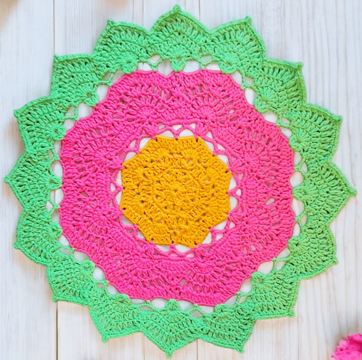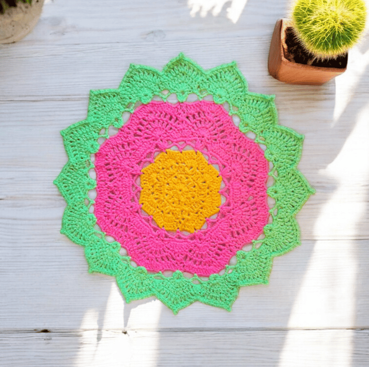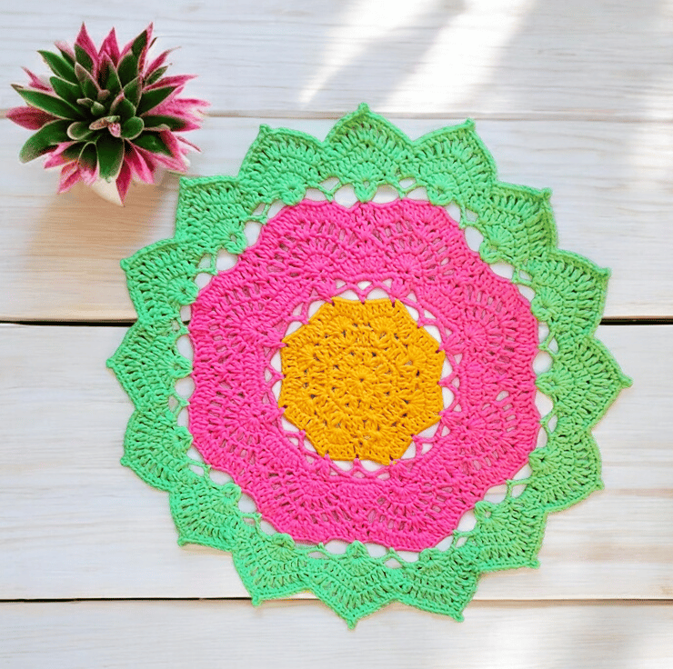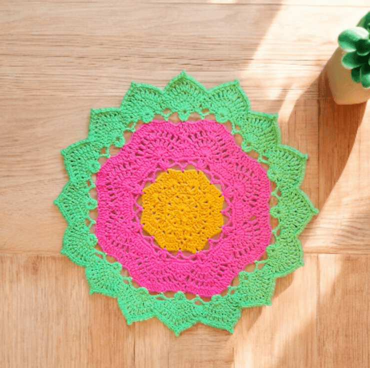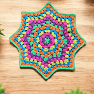 Bright mandala table mat / doily. 39 cm diameter. This large doily really is a statement piece, with its bright blocks of colour. Crocheted in a soft cotton blend for colour retention and ease of wash.