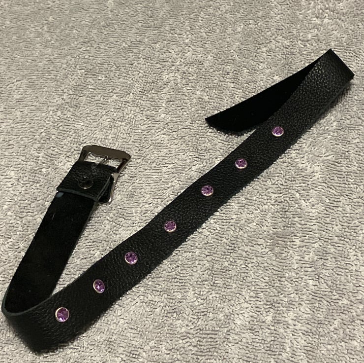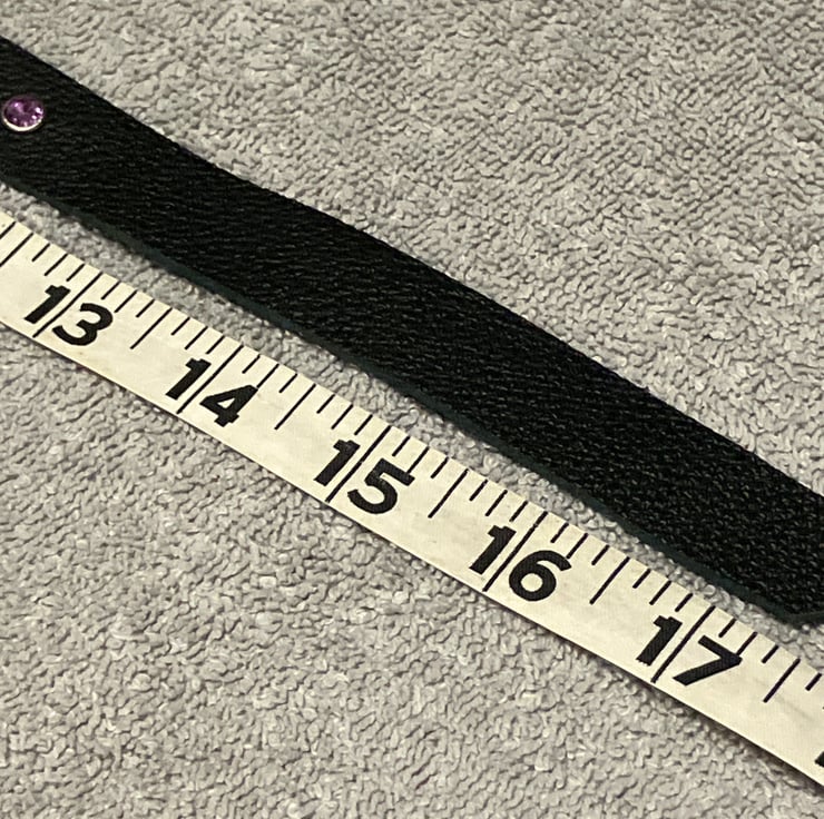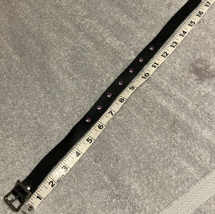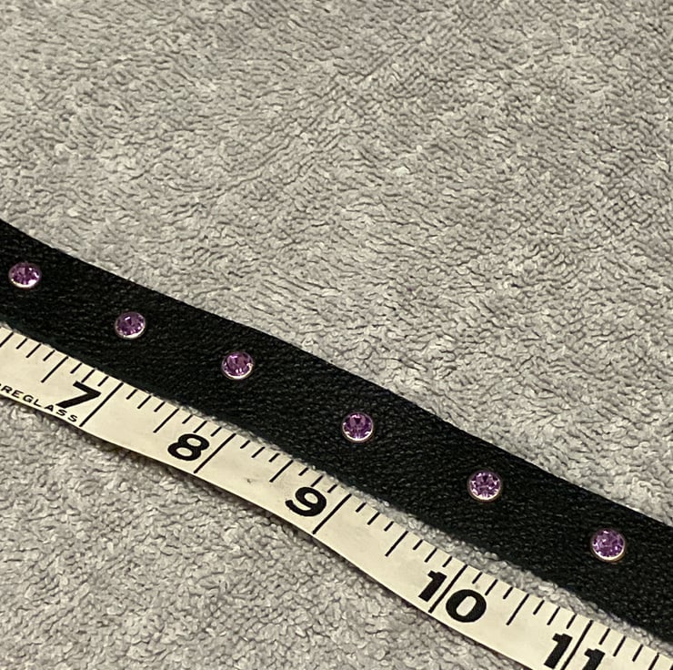 3/4" width -- soft black leather choker with 7 light purple crystal gemstones riveted onto the choker.