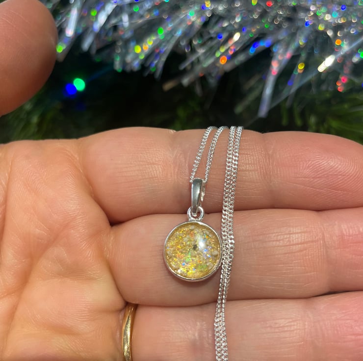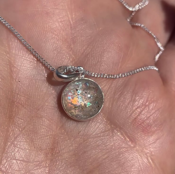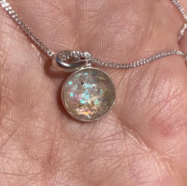Each pendant features a luminous stone with a primary colour of your choice, always alive with subtle flashes of other colours within — a natural “fire” reminiscent of opals. No two pendants are ever the same, making each one as individual as the story it represents.