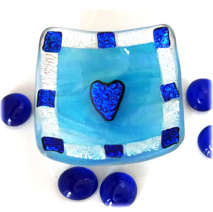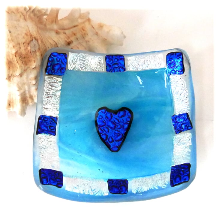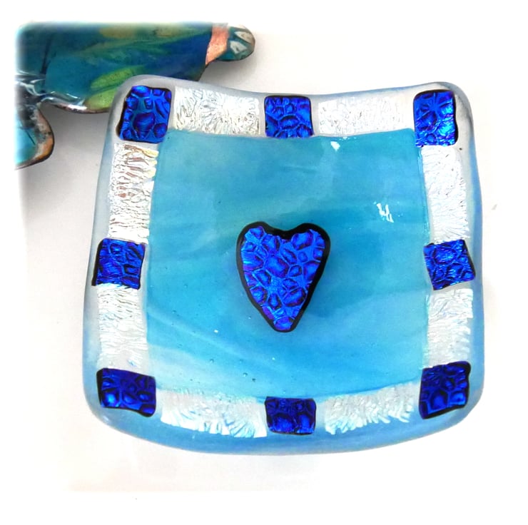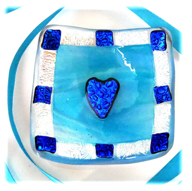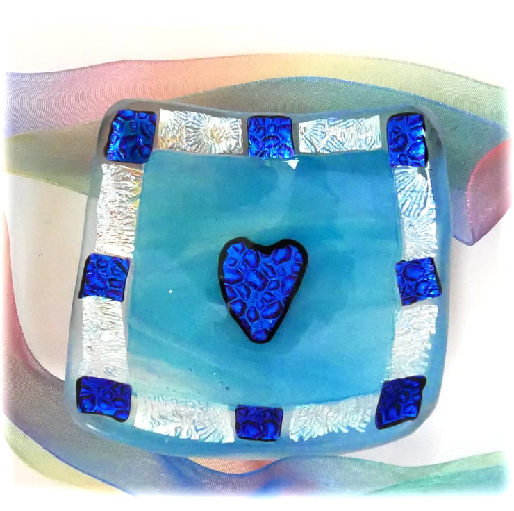 The base layer is clear Bullseye glass. The top a streaky pale turquoise with a heart I cut from dichroic glass in the middle. Then a botder round the turquoise of two types of dichroic glass, clear and black backed.