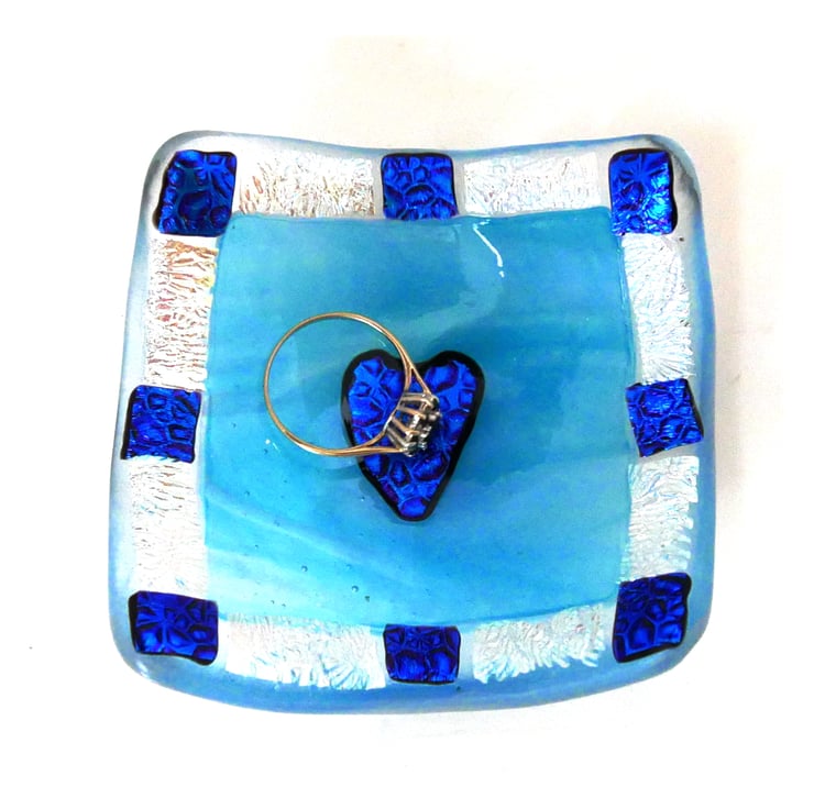 A little 7.5 cm square dish, twice fired in my kiln, first to full fuse all the glass together, 2nd to slump it over a little mold into a shallow dish shape.