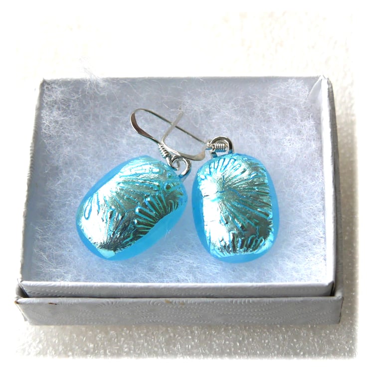 The earrings are hung from silver plated bails and then sterling silver hooks, the bails being securely glued in place to the back of the glass with strongest E6000 glue..