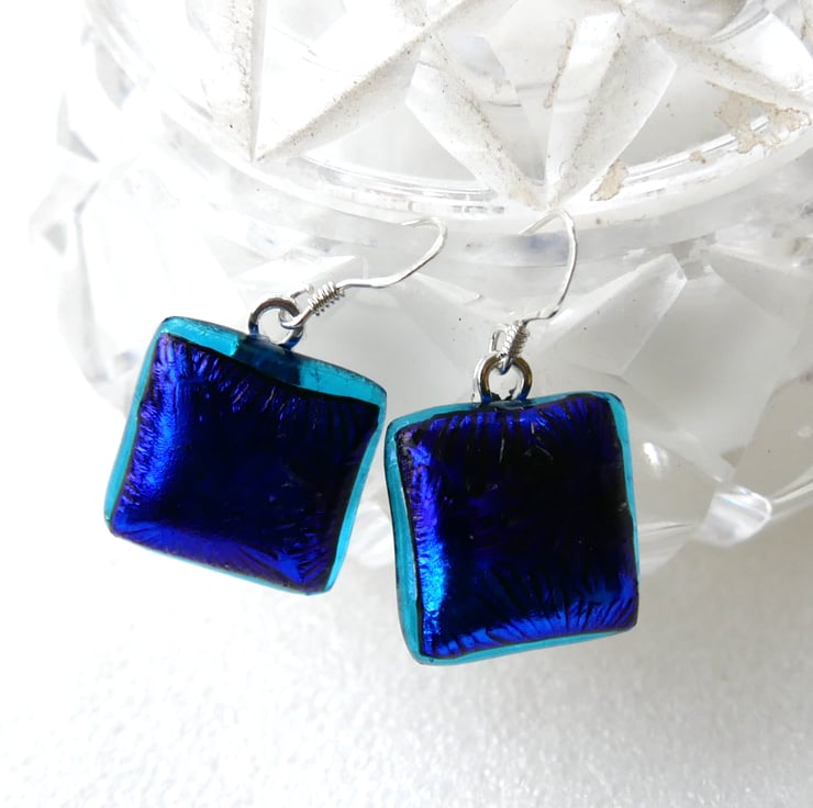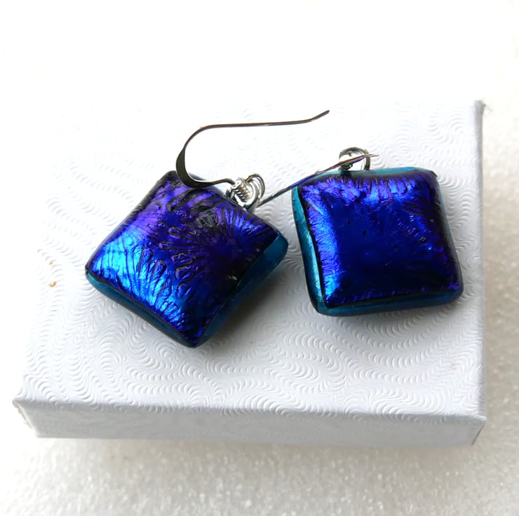 This series of Luxury earrings are designed to be specially eye catching with a full layer of dichroic glass and then further dichroic decoration on top.