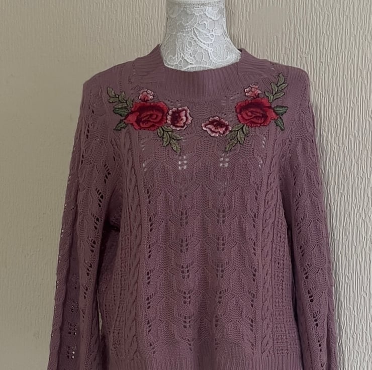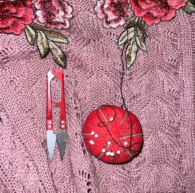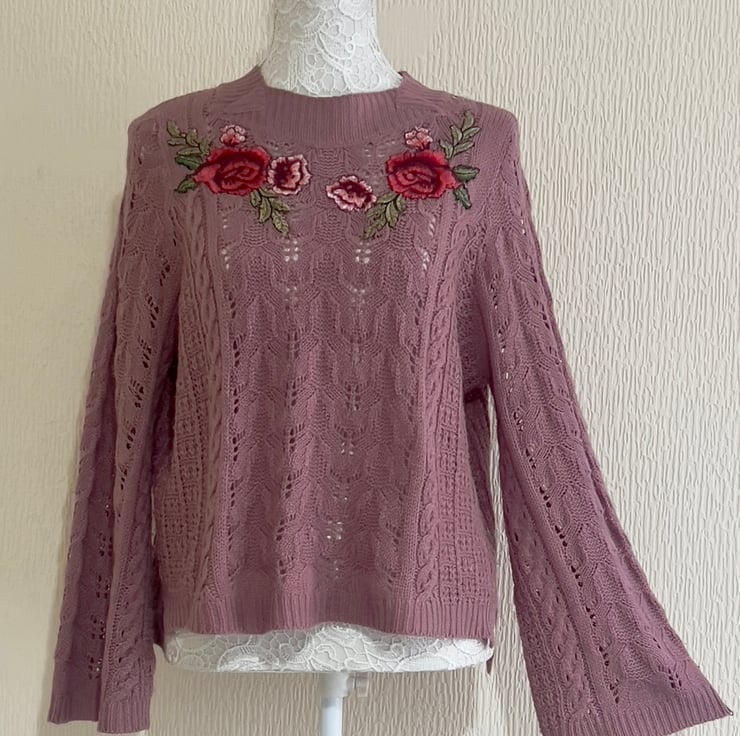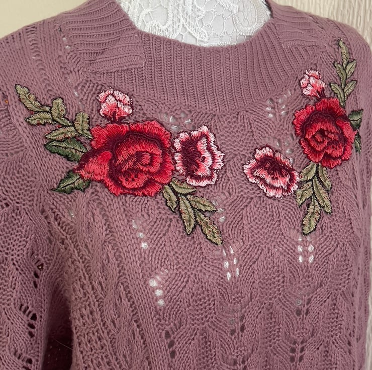 I brought this soft dusty pink cable knit jumper with me all the way from South Africa, Mr Price is a well know and favourite retail brand there. I gave it a new life by sewing rose embroidery patches across the neckline and chest.