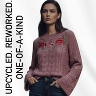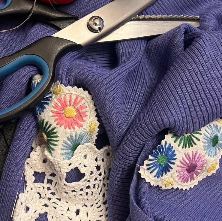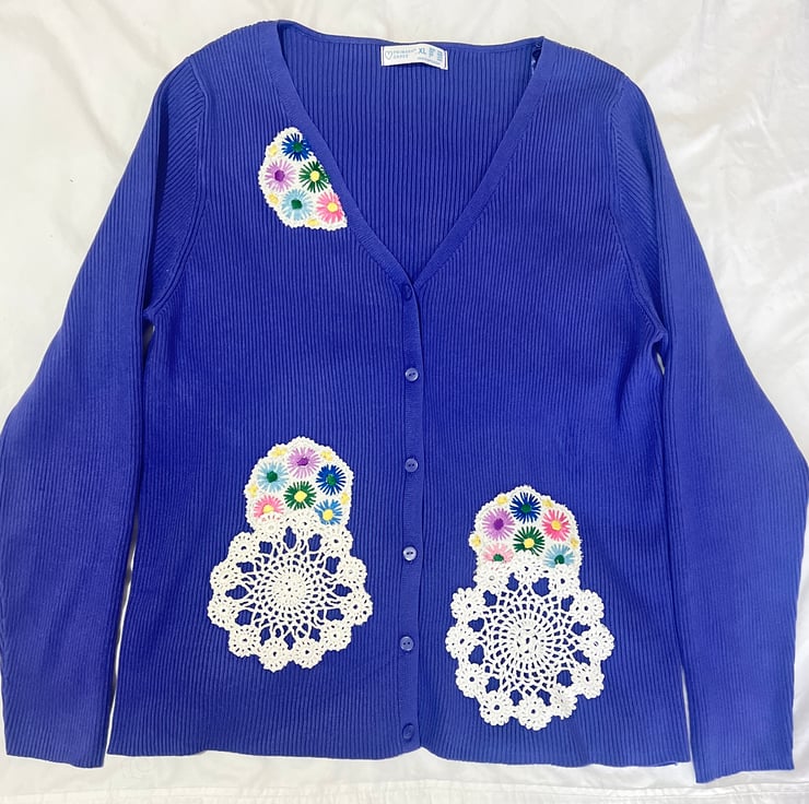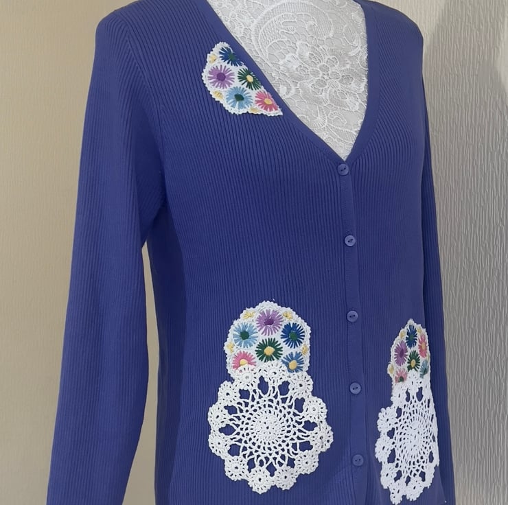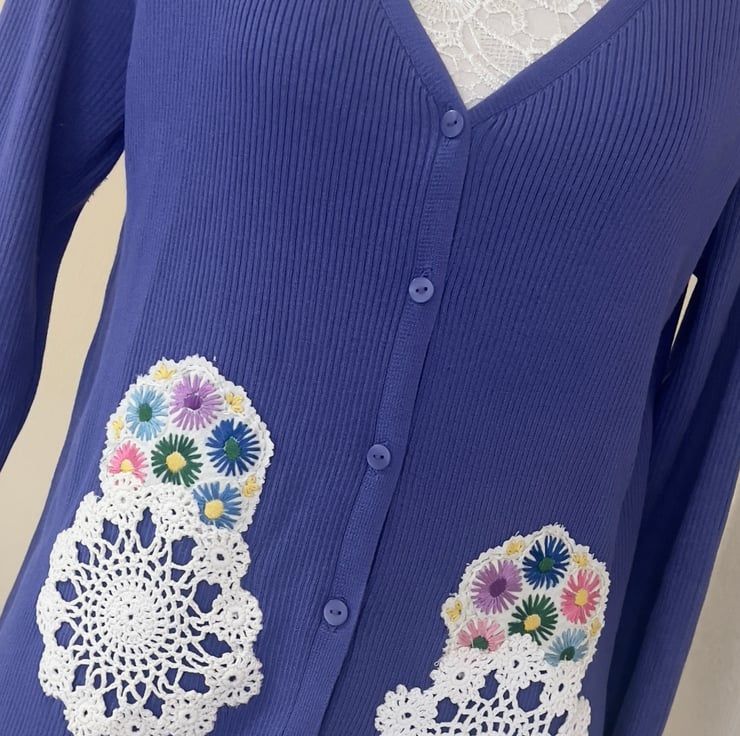 I took a deep purple ribbed button-up cardigan from Primark and upcycled it with white crochet vintage doilies and bright floral vintage embroidery across the chest and lower front.
