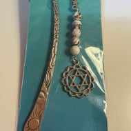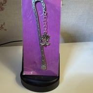 This is a beautiful metal bookmark in the shape of a hook with an attached chain and decorated flower head. The hook is carved in the form of an expanding chain from Tibetan silver is 12 cm long, the attached alloy chain is 5 cm long and holds a beautifully decorated alloy flower head.