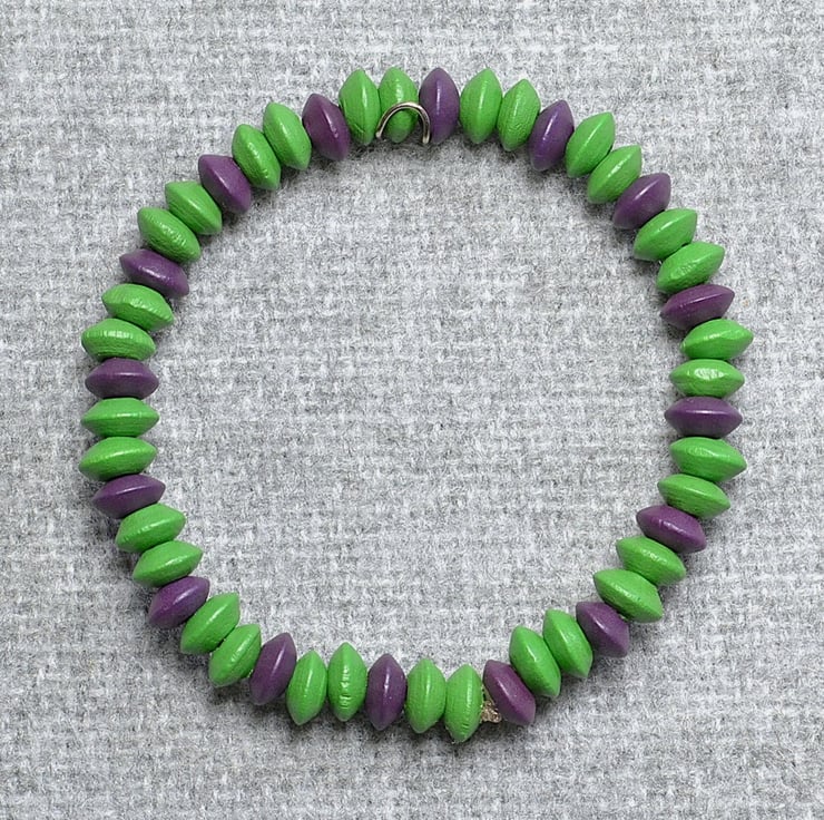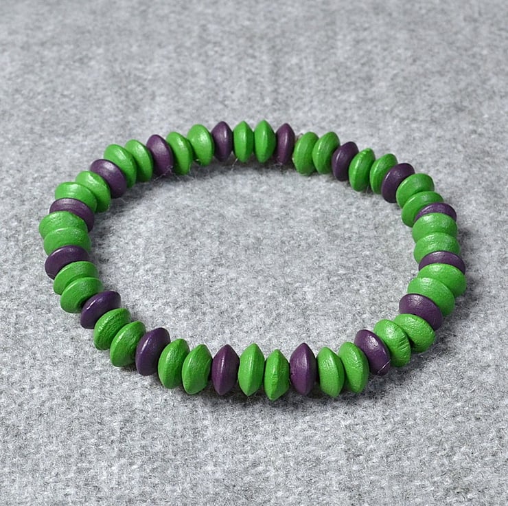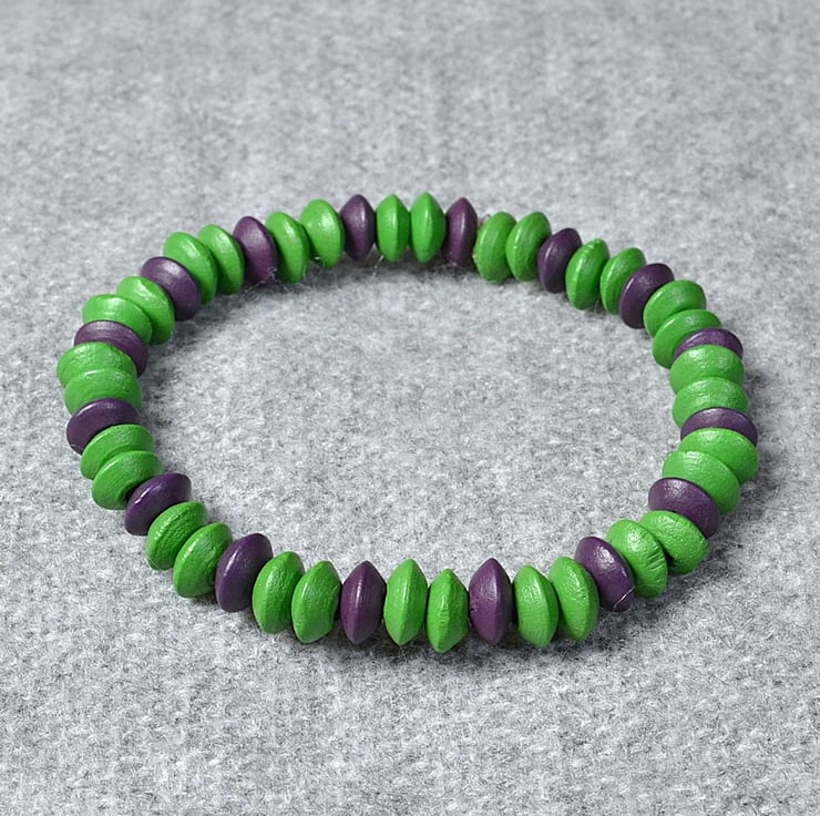 Bright and quirky colour combination of wooden rondelle beads in a lightweight, easy to wear bracelet. This bracelet measures approximately 19cm, or 7 1/2 inches, unstretched. It is strung on jewellery elastic, designed to be rolled over the wrist for a clasp free easy fit.