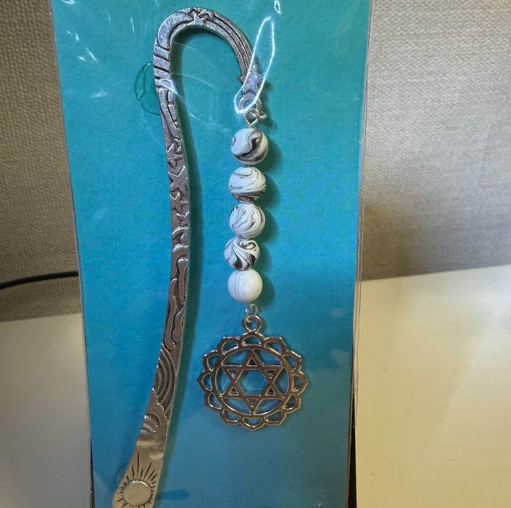 Metal carved hook bookmark with attached chain and Star of David/Soloman’s Seal on a beaded chain.