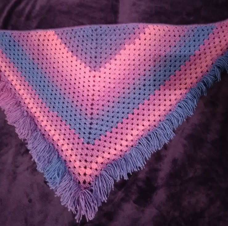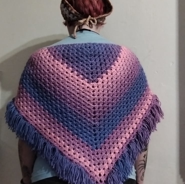 Crocheted shawl with hand-tied fringe in a cheerful pink and purple ombre. With ties to stay in place this piece is both whimsical and practical.
