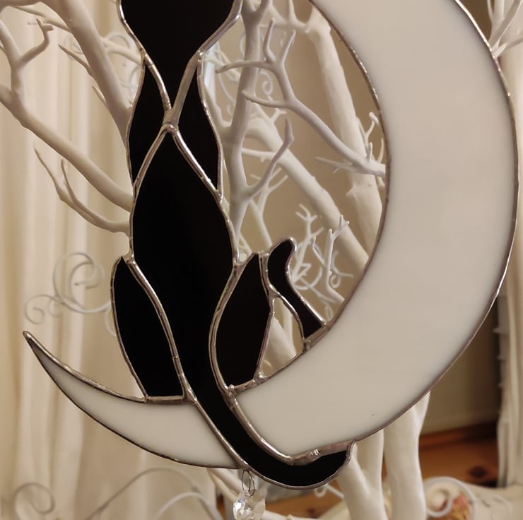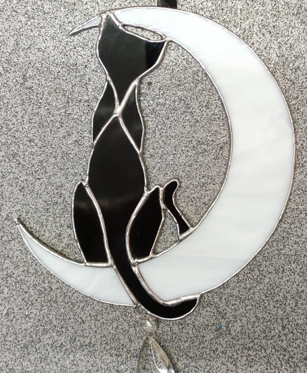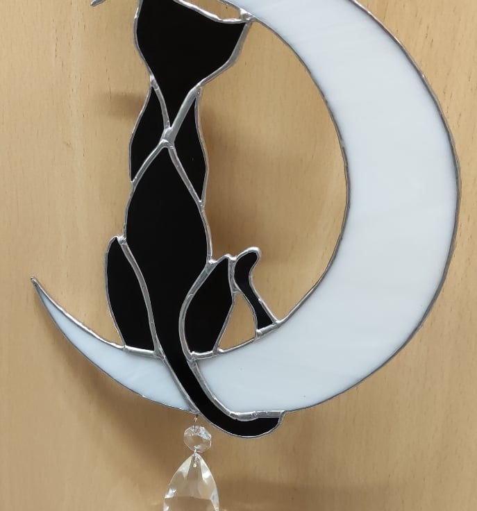 Handmade stained glass hanging featuring a black cat sat on a crescent moon with chandelier crystals hanging from it.