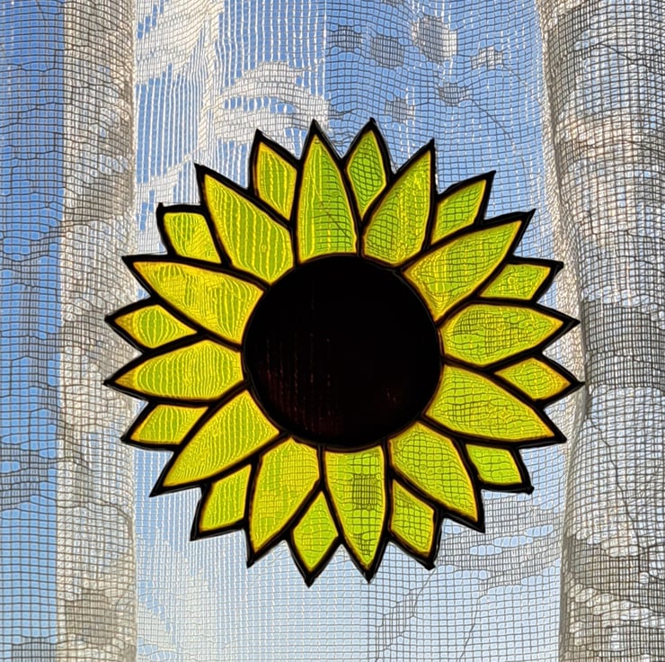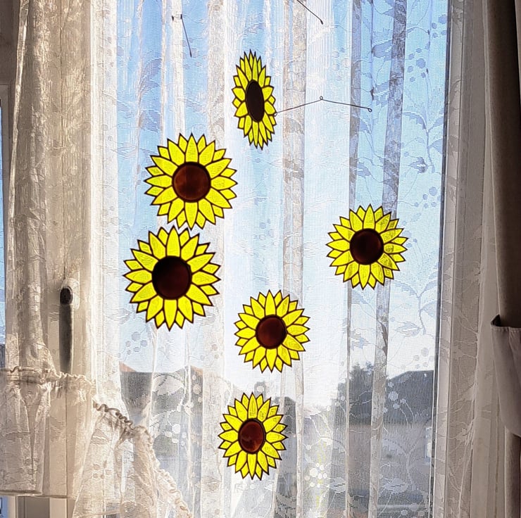 The sunflowers on this mobile have the effect of stained glass, but they are hand made and painted on acrylic sheet. When cut out they are hung from wire yokes, using invisible thread so that they float around in the air apparently unsupported. Hung in front of a window or other light source they bring a taste of summer, even in the middle of winter!