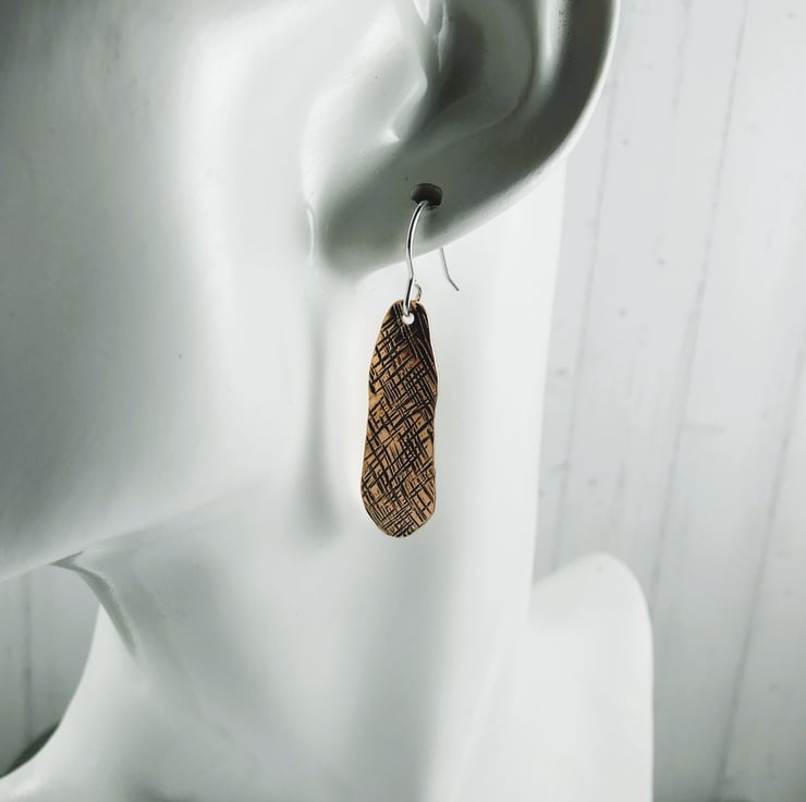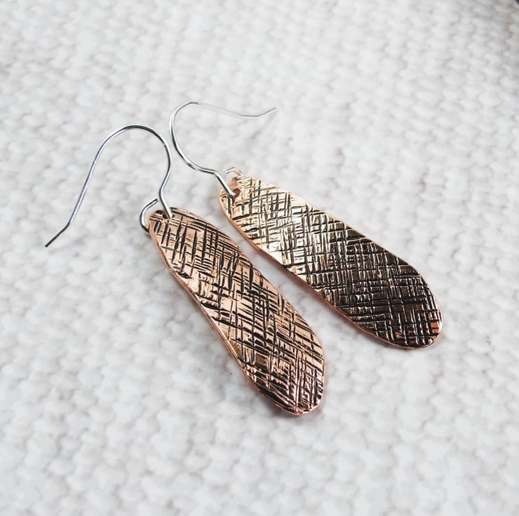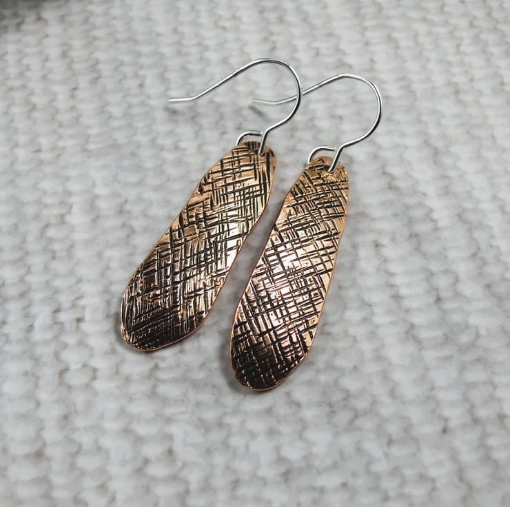 I have cut the teardrop shapes from copper sheet then created the crosshatch pattern with a hammer, I have highlighted the pattern with black enamel paint. Fitted to sterling silver ear hooks
