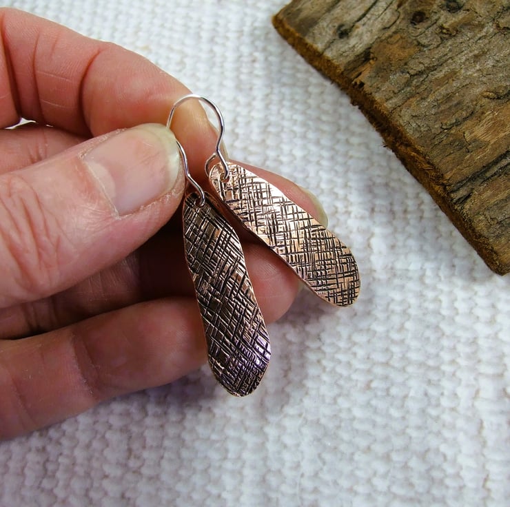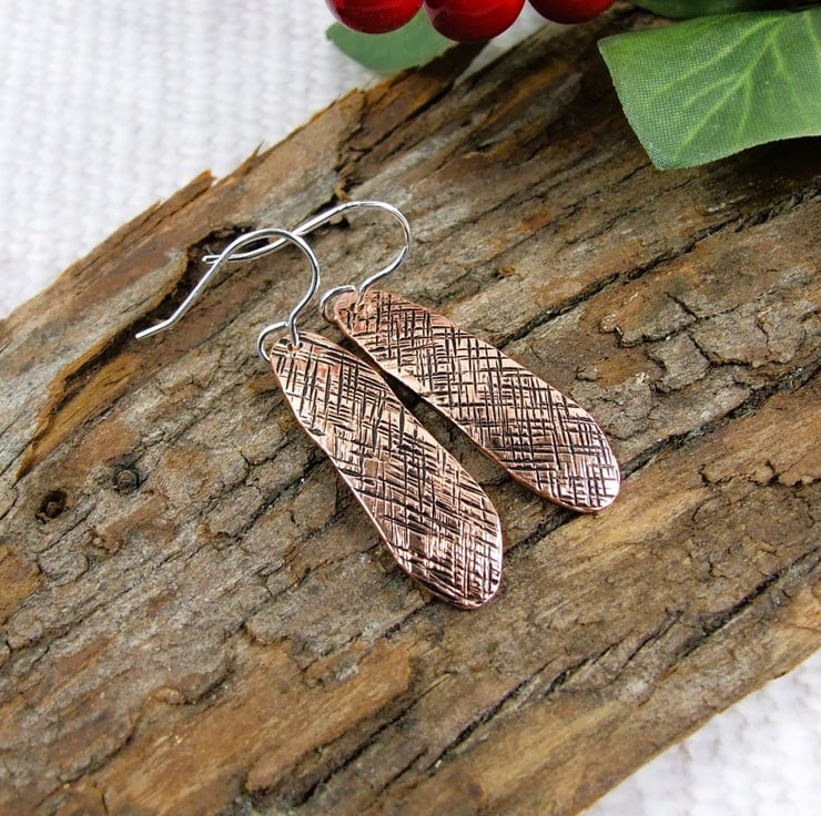 Earrings, Copper Teardrops with Crosshatch Pattern and Silver Earwires
