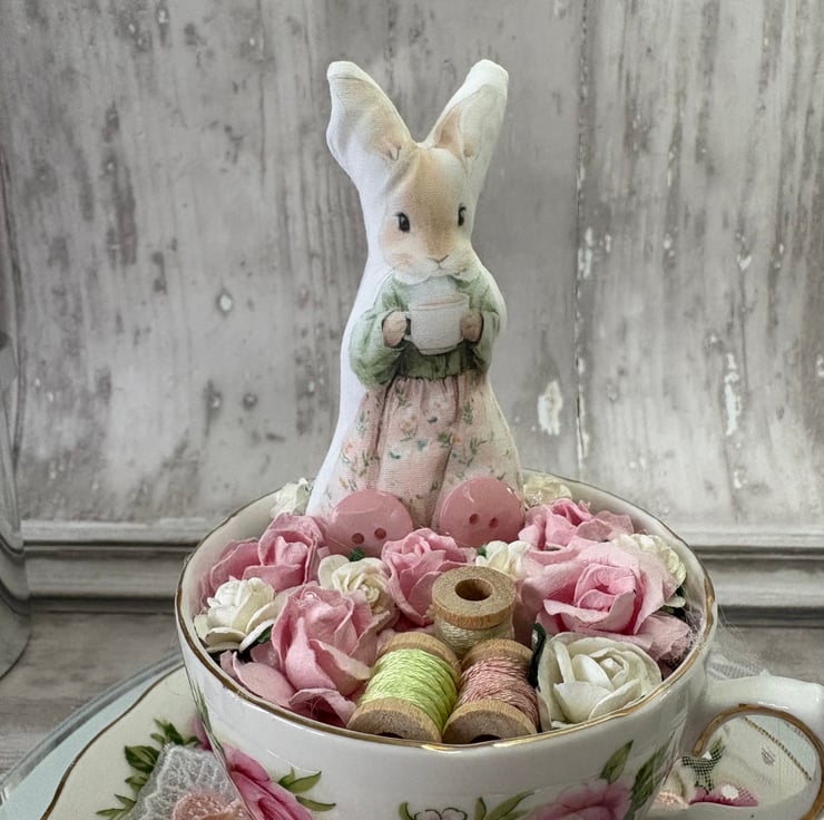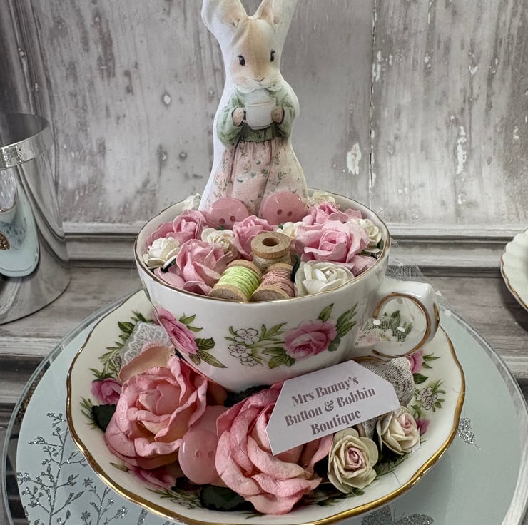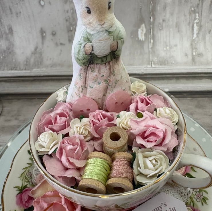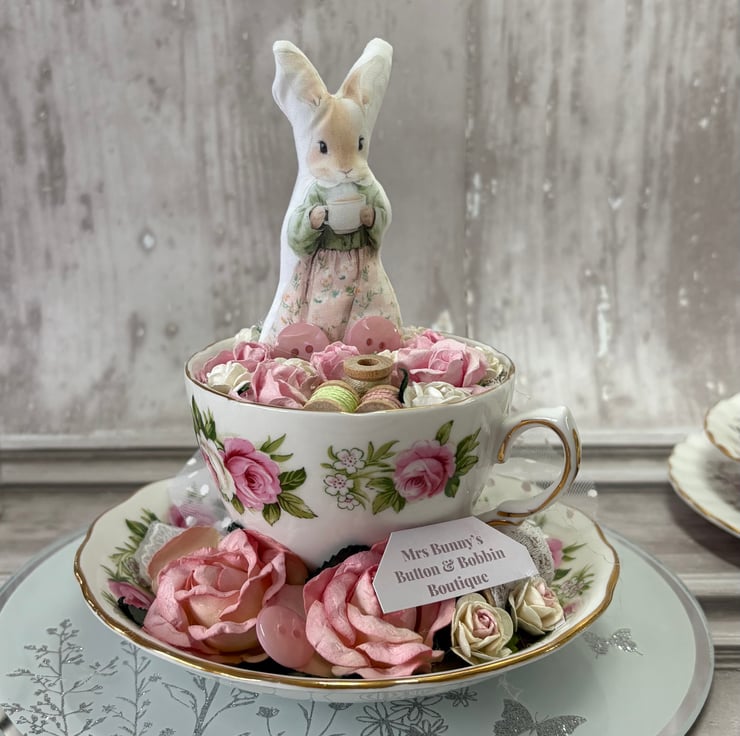 Teacup with an image from Cottage Days - Mrs Bunny's Button & Bobbin Boutique. Mounted into a vintage style teacup. the saucer has roses, ruffled lave, lace on a wood spool and a sign for Mrs Bunny's shop. The inside of the cup has a rose card liner with roses, wood bobbins and thread, not forgetting buttons to make up the decorative element. Mrs Bunny is printed onto cotton and adhered with a dowel and glue, holding her cup of tea ready to welcome you into her little shop.