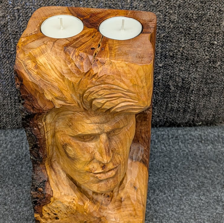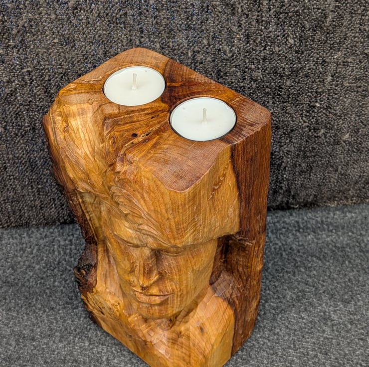 Very unique wooden carved tea light holder carved by myself from lime wood with part of tree bark and some places have a beautiful burll pattern.