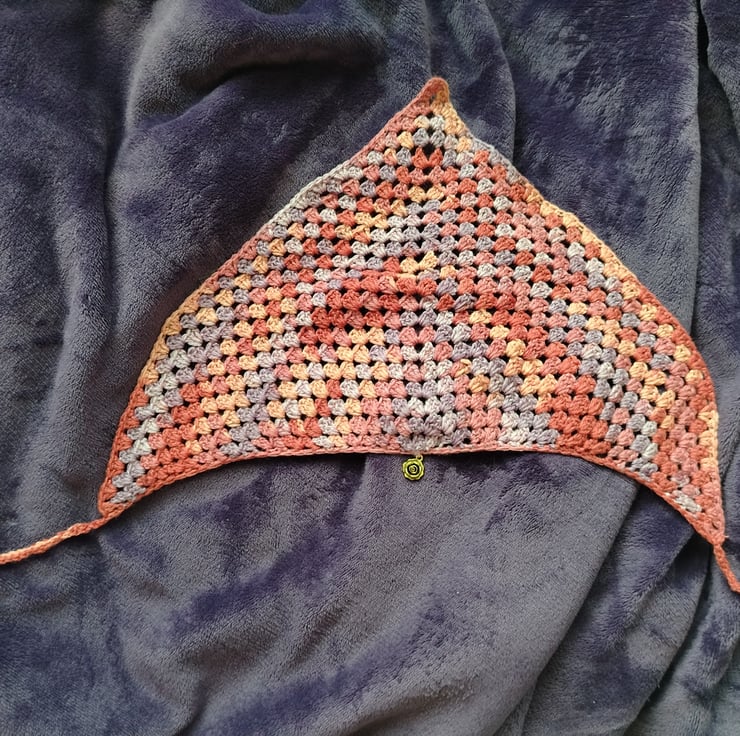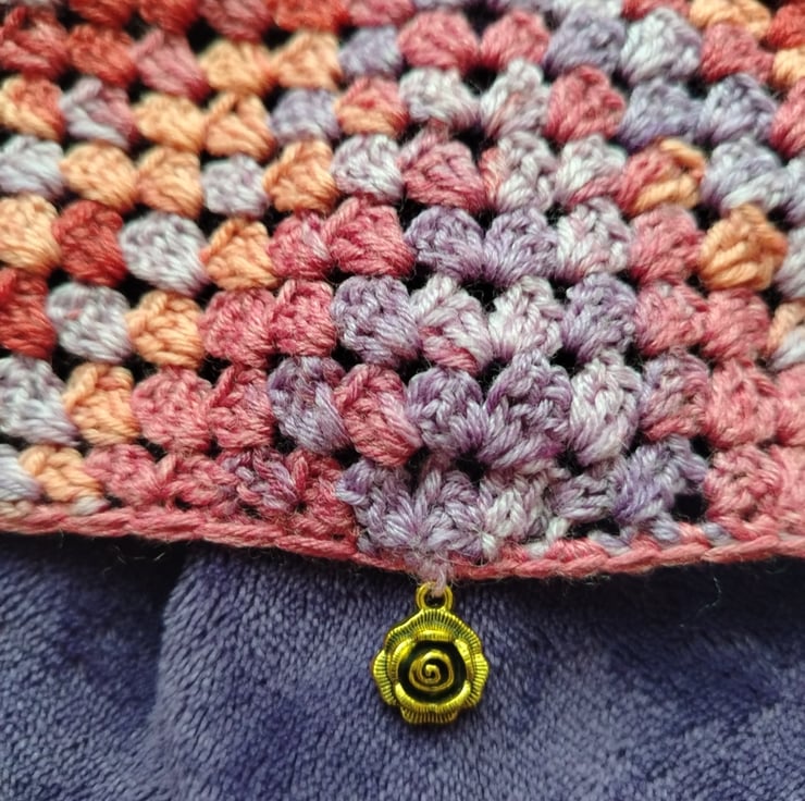 Crocheted in a pink purple and peach ombre, this kerchief features a gold toned rose charm at the centre. Pretty and functional, measures 17" across the front and 15.5" along to the point.