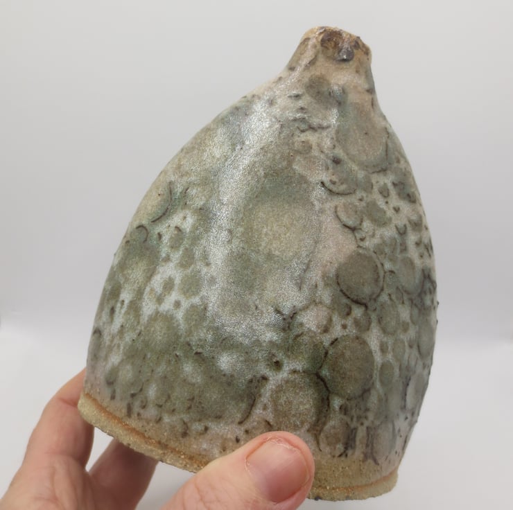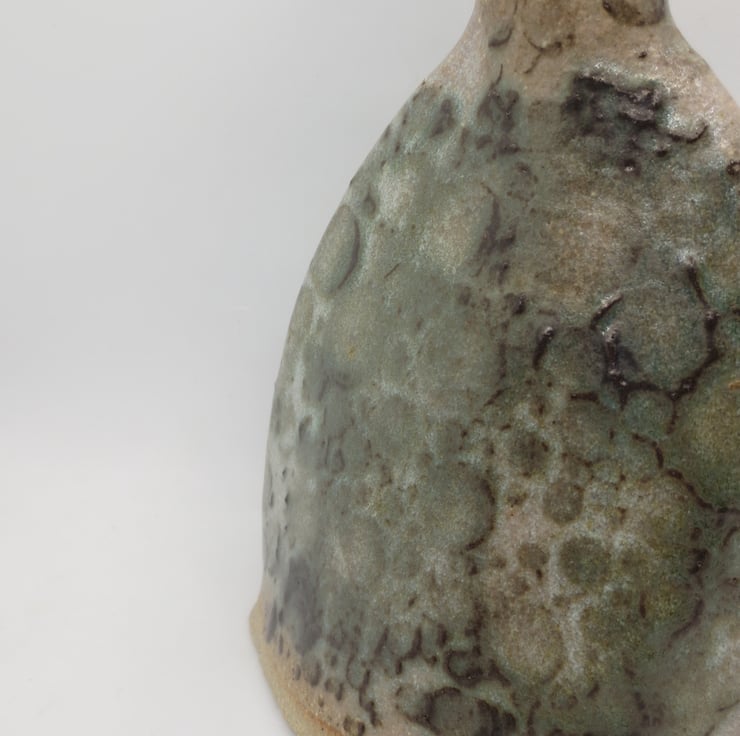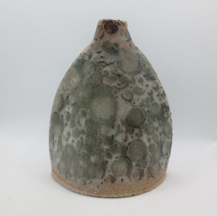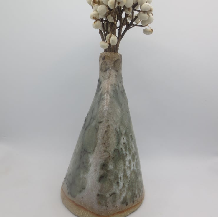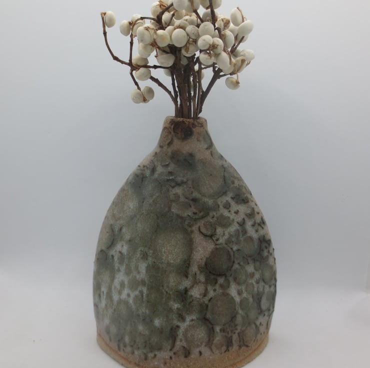 A hand built bud vase made from textured buff coloured clay in satin white glaze over a green reactive slip decoration. Fired to stoneware temperature (1260C). Would suit dried flowers but will hold water.