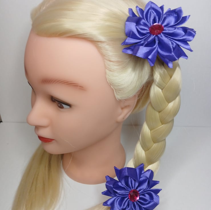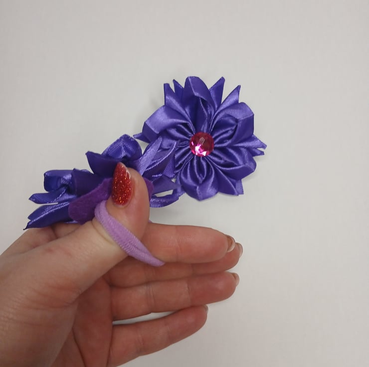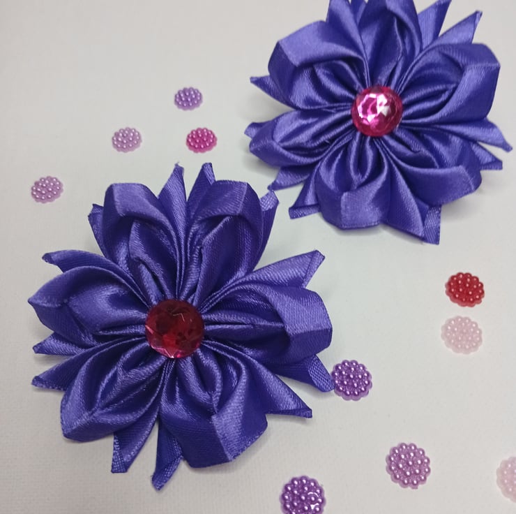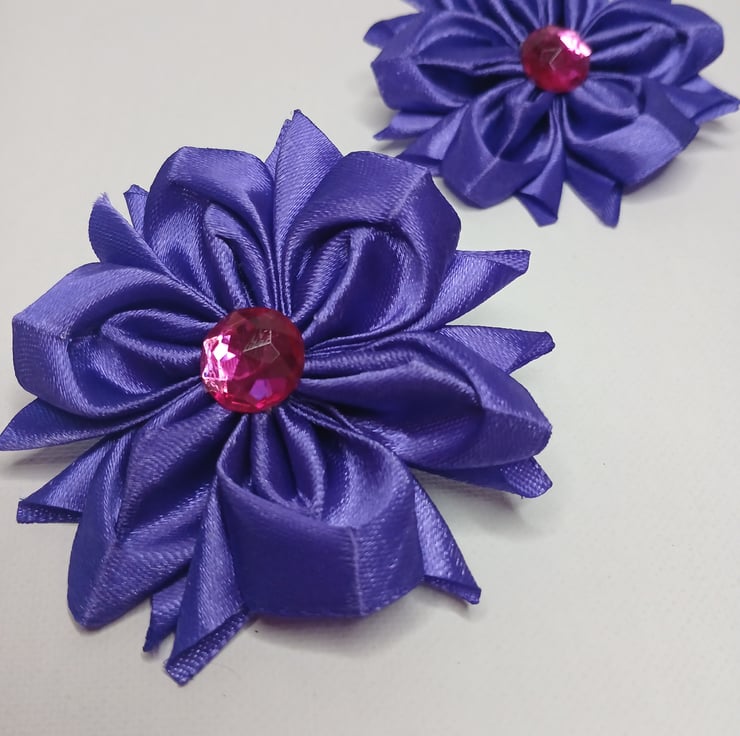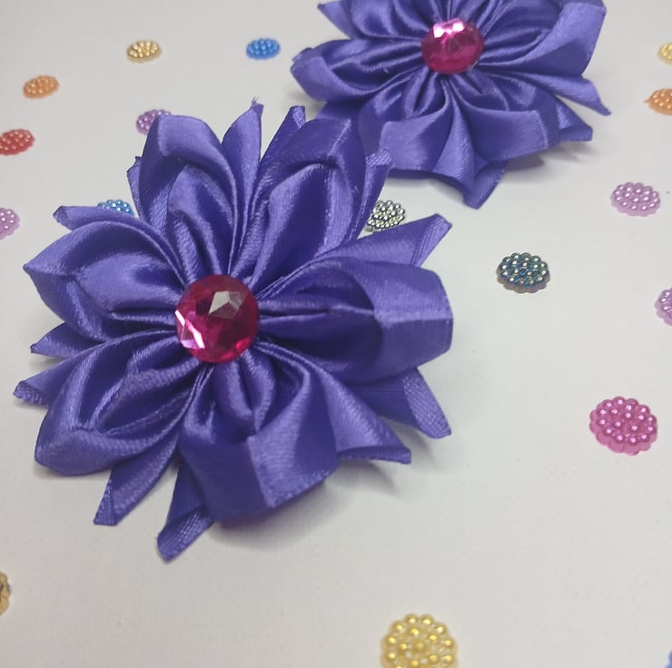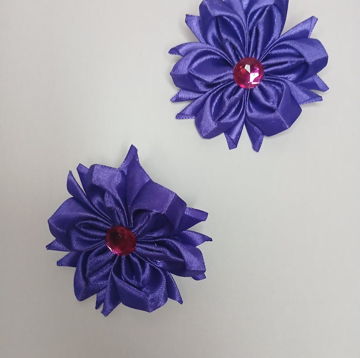 A delightful set of handmade hair clips that makes a perfect small gift for girls, or a sparkly treat for anyone who loves bold floral accessories. Lovingly crafted in the UK from vibrant purple satin ribbon with a glistening gem centre.