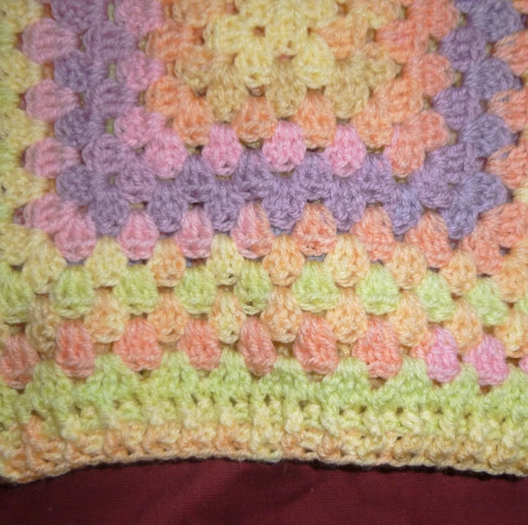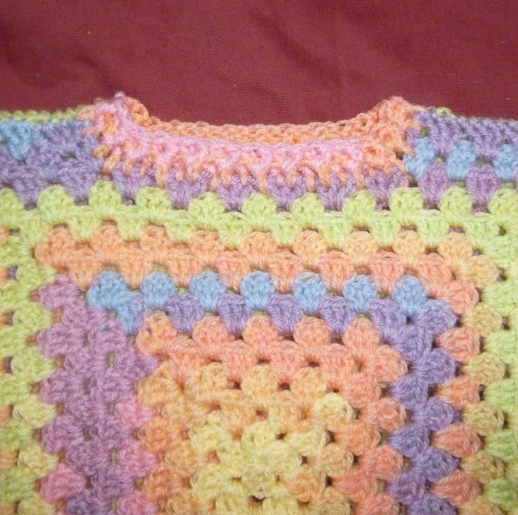 Crocheted in a pretty random yarn, it can be worn with back or front facing as they are slightly different colours. The front and back have identical shaping and so you can choose which way you prefer