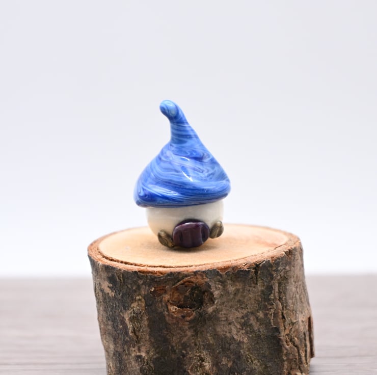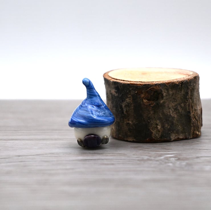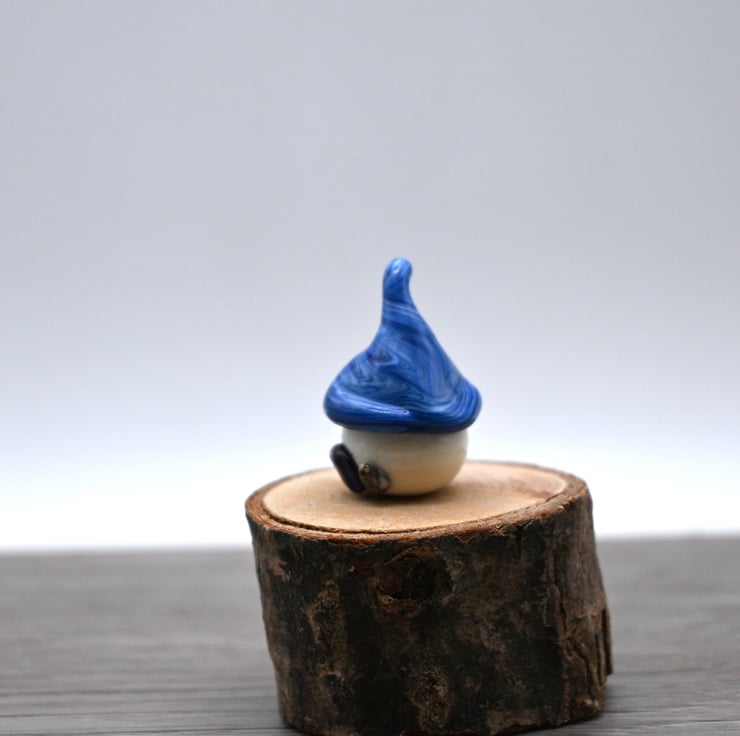 A small glass toadstool fairy house made by hand using a technique called lampworking.