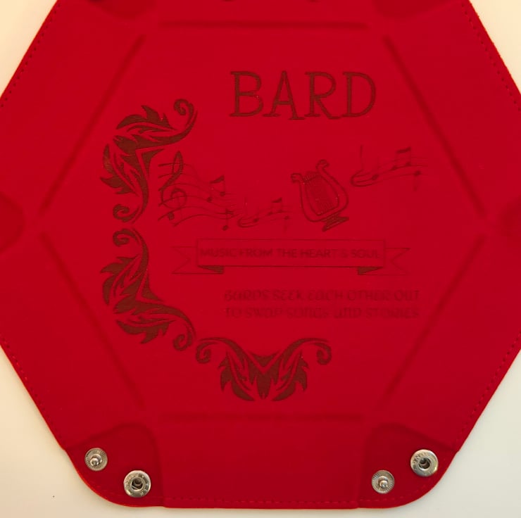 This Bard dice tray is designed for Dungeons & Dragons players who want to keep their dice rolls contained while adding character to the table.