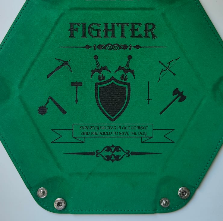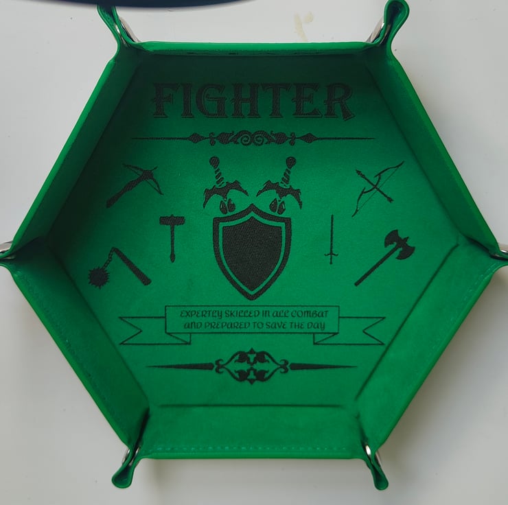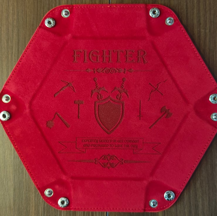 Inspired by the Fighter class, the engraved design reflects the strength and presence of the archetype, making it a practical and decorative addition to any tabletop setup. Ideal for regular game nights, longer campaigns, or as a thoughtful gift for a fellow adventurer.