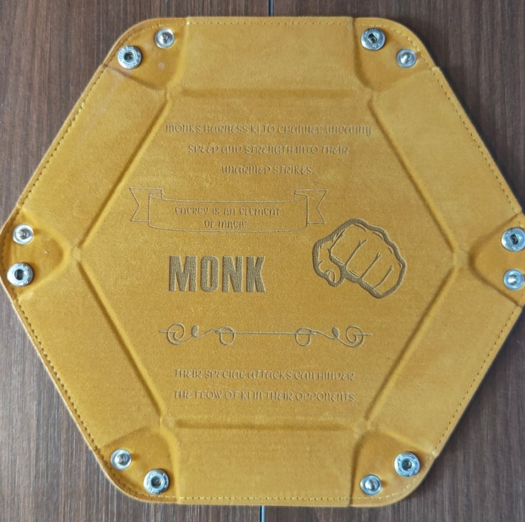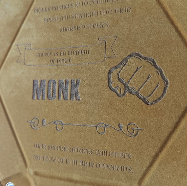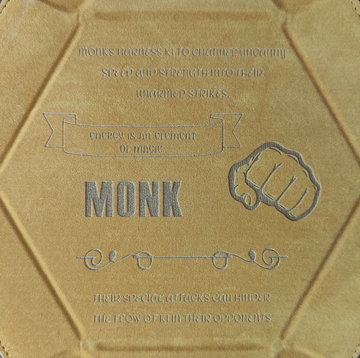 Inspired by the Monk class, the engraved design reflects the strength and presence of the archetype, making it a practical and decorative addition to any tabletop setup. Ideal for regular game nights, longer campaigns, or as a thoughtful gift for a fellow adventurer.