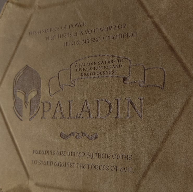 Inspired by the Paladin class, the engraved design reflects the strength and presence of the archetype, making it a practical and decorative addition to any tabletop setup. Ideal for regular game nights, longer campaigns, or as a thoughtful gift for a fellow adventurer.