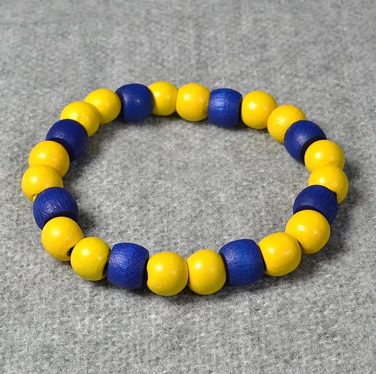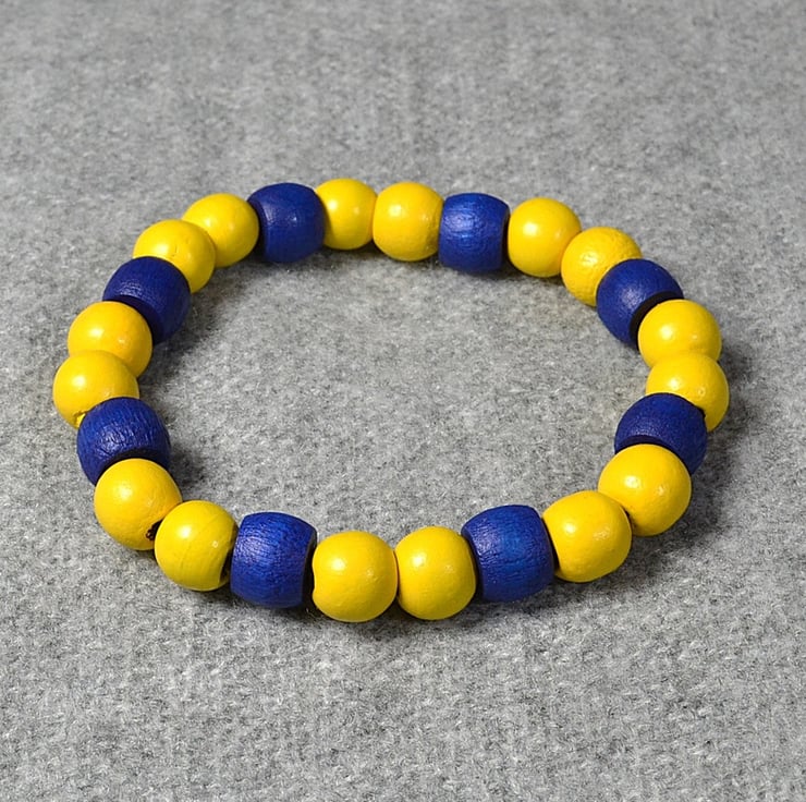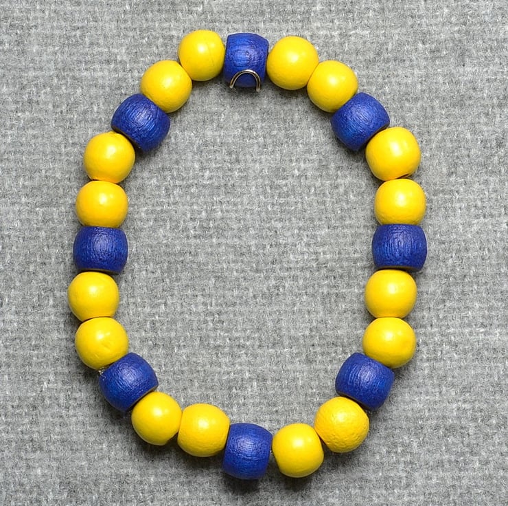 Darker blues and yellow are a striking combination, for those days when you just need a splash of colour to brighten the day. This wooden bead bracelet measures approximately 20cm, or 8 inches, unstretched, making it a fraction longer than average. It is strung on jewellery elastic, designed to be rolled over the wrist for easy fit and clasp free wear.