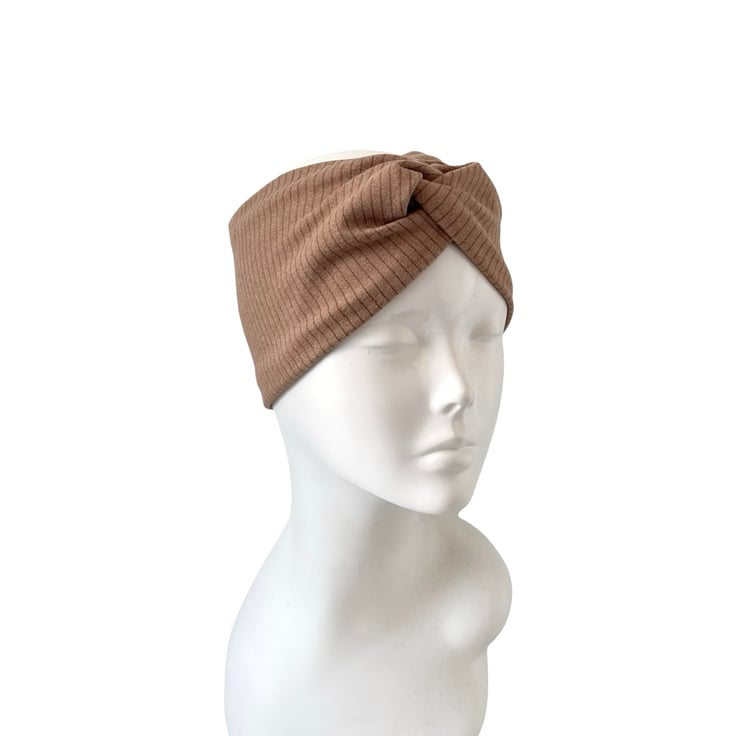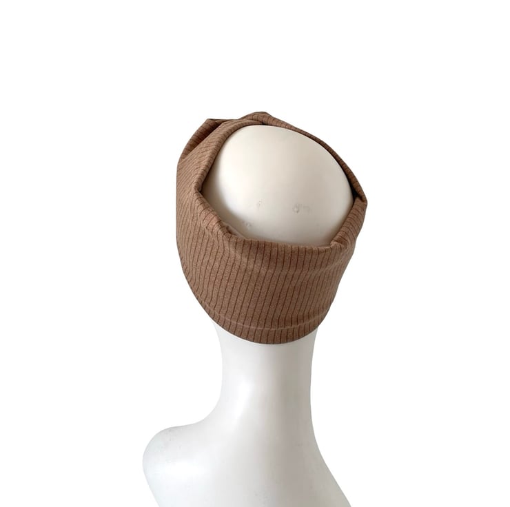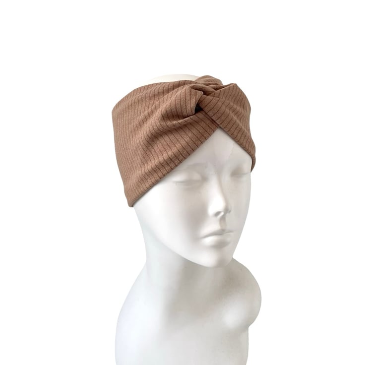 Camel Beige Satin Lined Twisted Headband Wide Brushed Knit Jersey Head Wrap