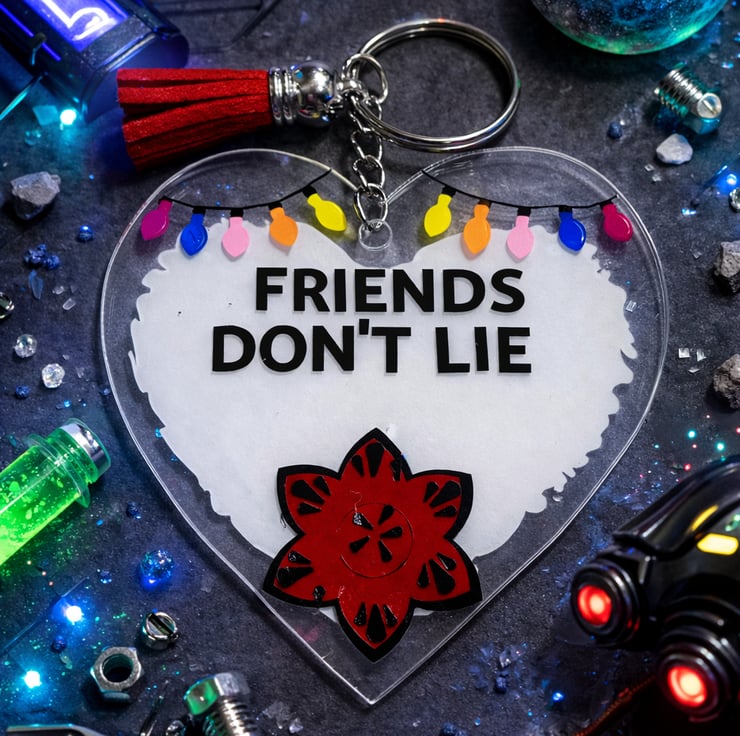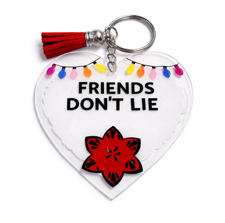 This handmade acrylic heart keyring is inspired by Stranger Things and features the iconic quote “Friends Don’t Lie”. Designed with bold black lettering, retro-style fairy lights and a striking red flower detail, it captures the nostalgic 80’s sci-fi vibe loved by fans of the show.