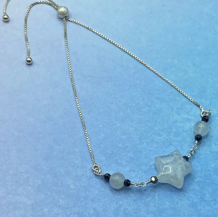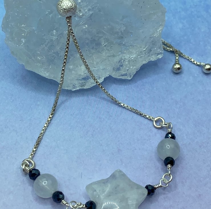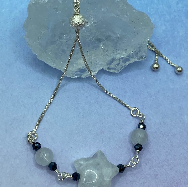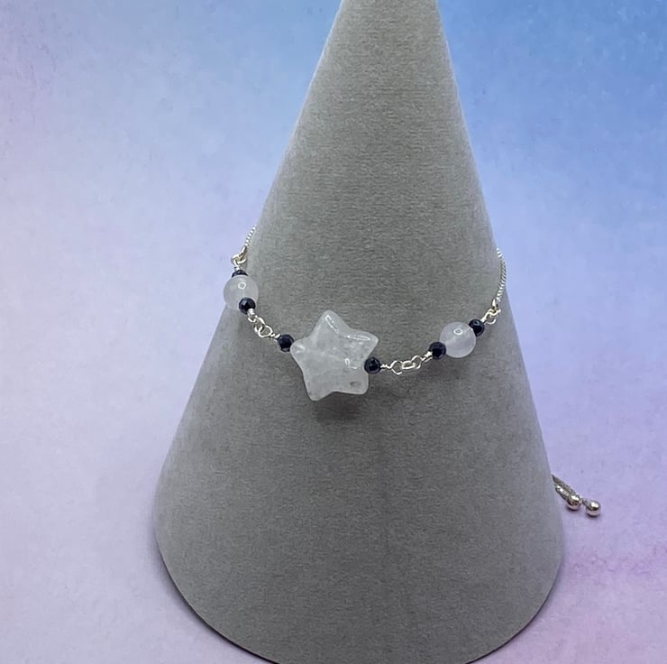 A striking silver plated slider bracelet with a central white quartz star, surrounded by white quartzite rounds and tiny 2mm faceted black spinel stones that provide a subtle sparkle.