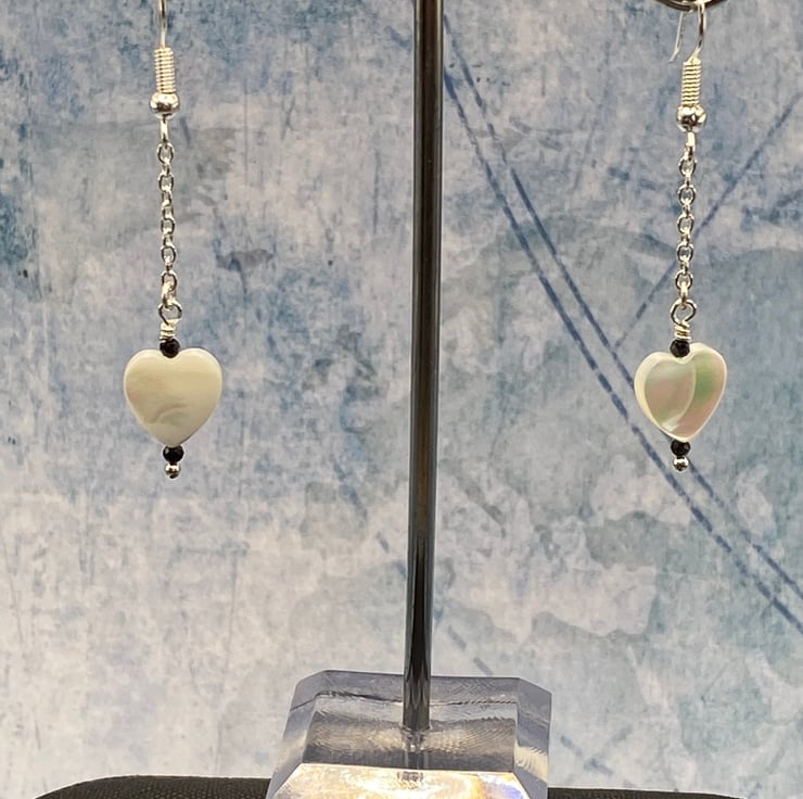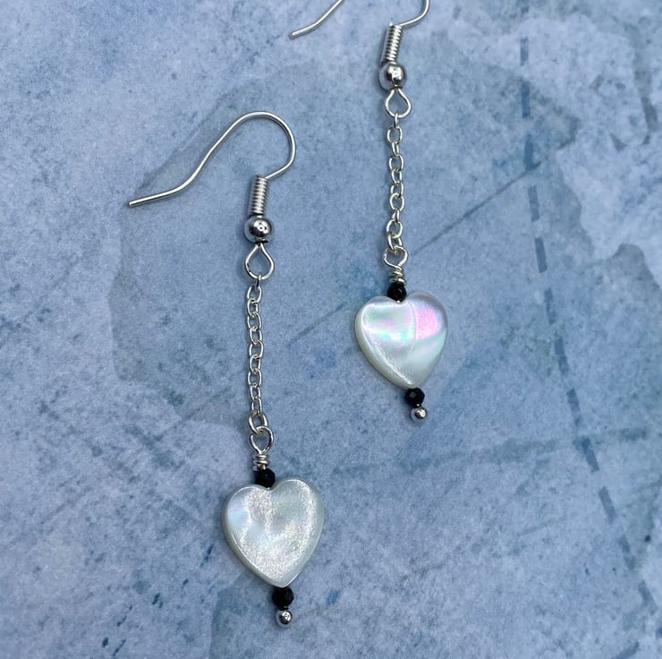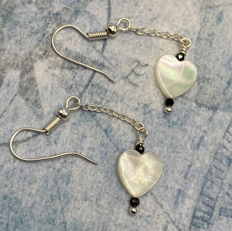 A pair of mother of pearl heart charm drop earrings, topped with tiny 2mm black faceted spinel stones for a subtle sparkle. Everything's linked together using silver plated chain, wire and matching earring hooks.